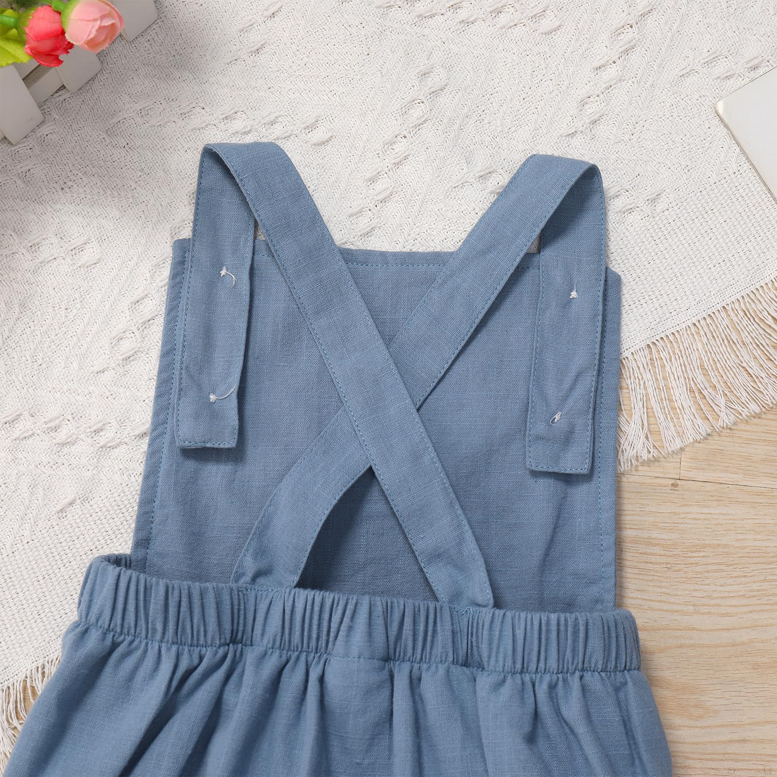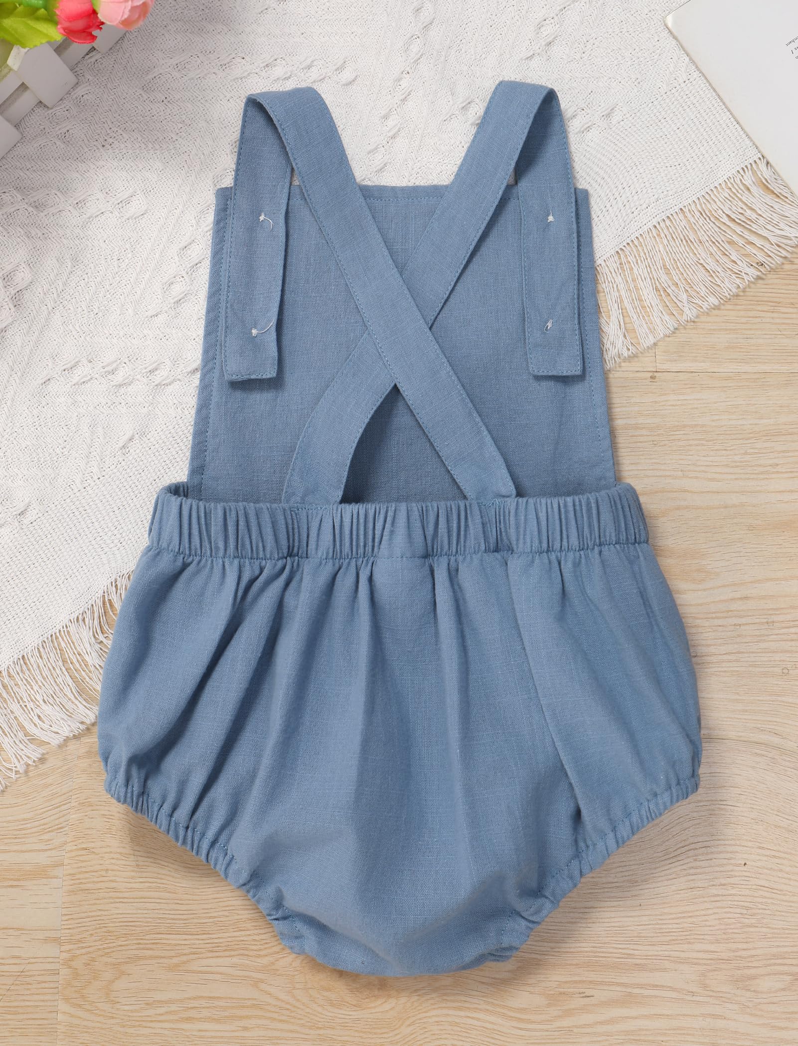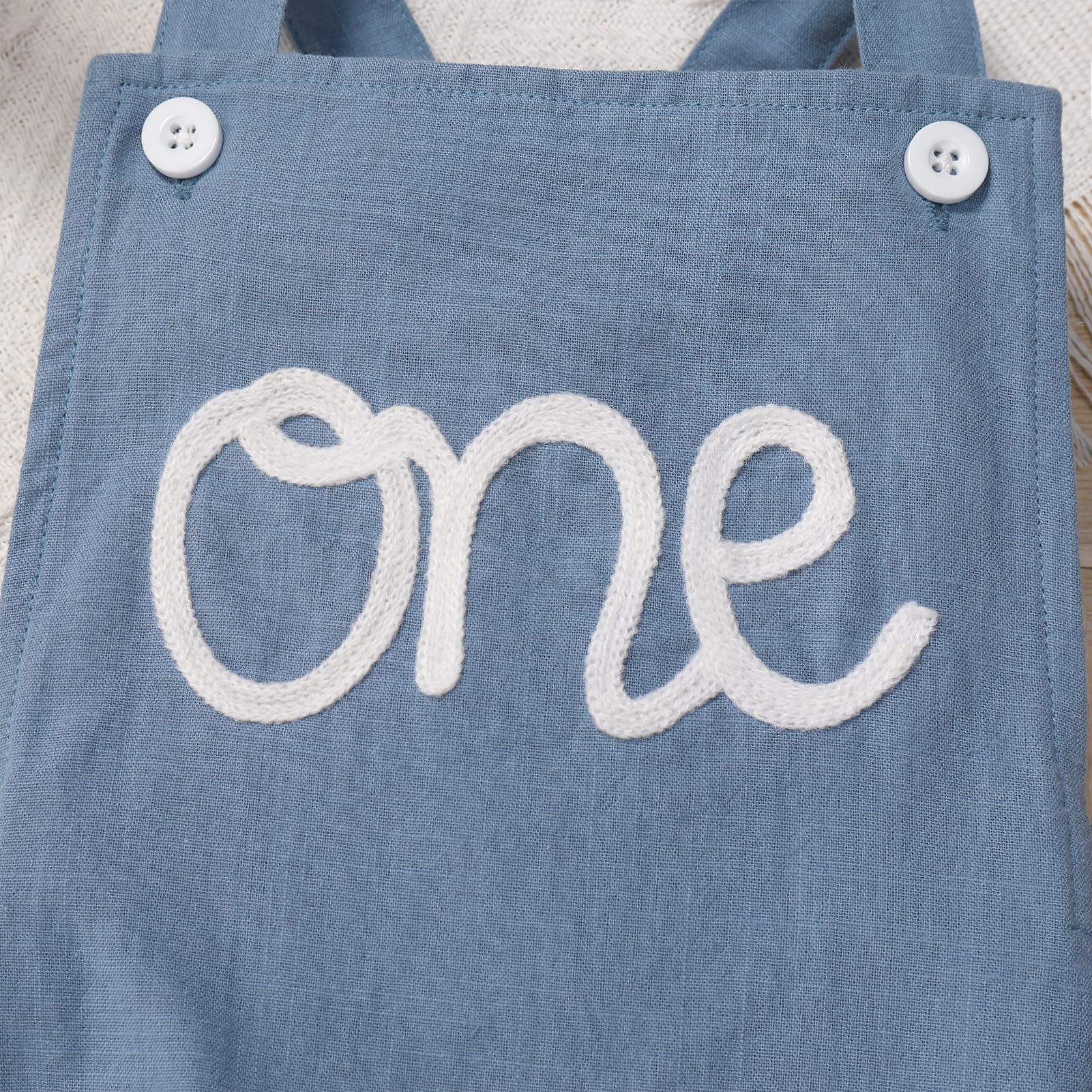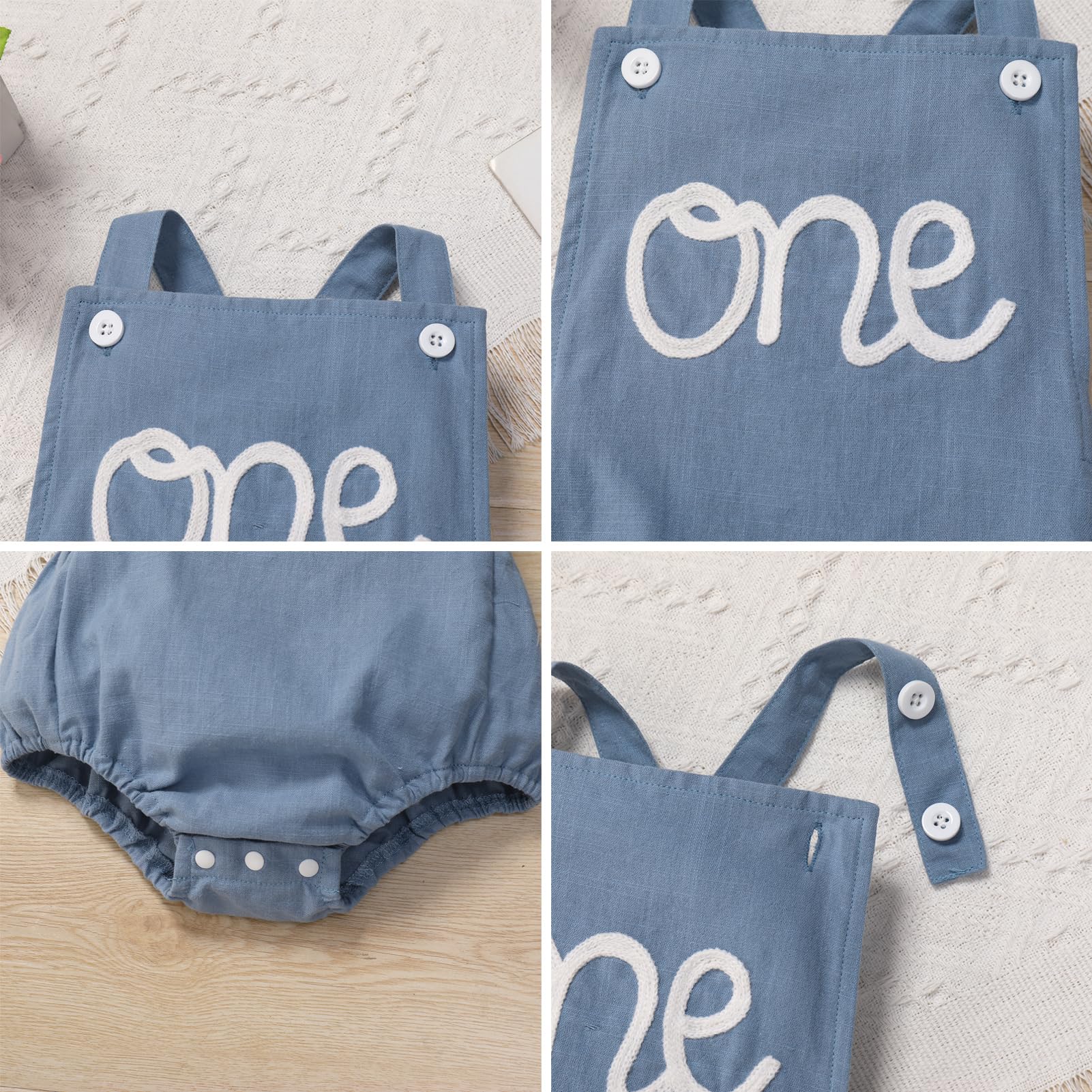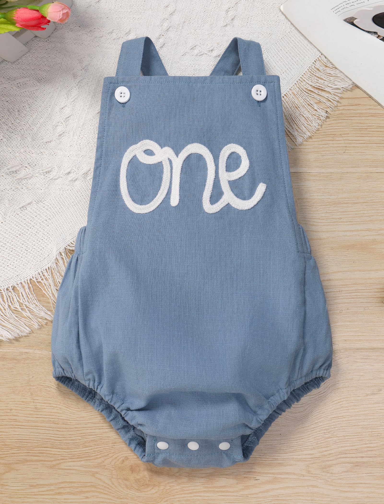 Boho Birthday Outfits for Baby Boy Girl: Adjustable spaghetti straps square neck jumpsuit, each shoulder strap with two buttons, adjust the tightness through the buttonholes. Elastic band at back, adjustable straps that crisscross in back, allows for a customized ease and fit to different body shapes. With 3 snaps at the crotch, easy to change diapers. Embroidered with the letter "One" dog eras on the front, adorable as 1st birthday outfit, baby photoshoot outfits boy girl for toddler;