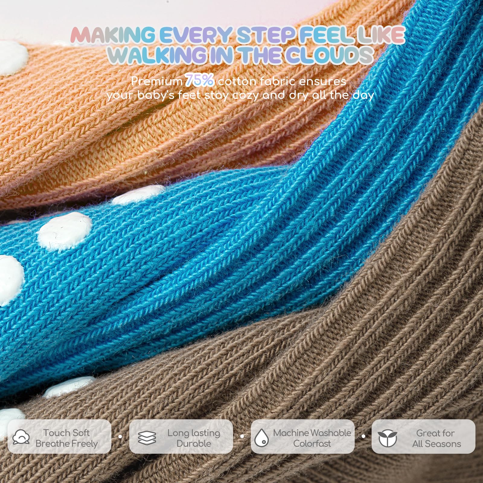 🌈PREMIUM COTTON FABRICS:These socks are made of superior cotton and synthetic fibers, providing a balance between comfort and durability. Elastic and stretchable fabric confirms it won’t slip/fall off while snug fit as baby foot grows.The soft and breathable fabric ensures your kids feet stay cozy and dry throughout the day. The grips on the soles could still maintain their effectiveness even after multiple washes.