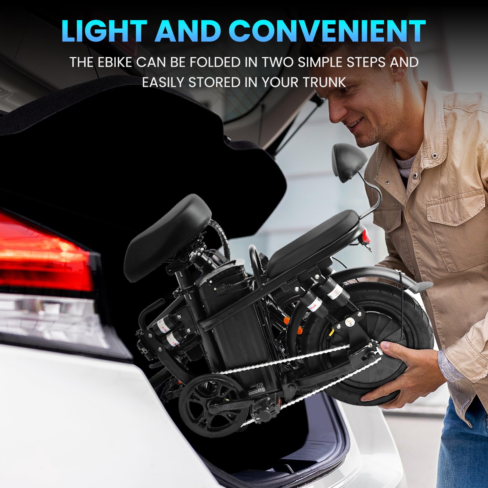 Folding Design for Convenience: This 2 seater folding electric bike weighs just 30 kg (66 lbs), making it easy to store in a car trunk. Perfect for travel, camping, and hiking, it features a front bag, mobile phone charging holder, and a safety alarm, providing both practicality and convenience.
