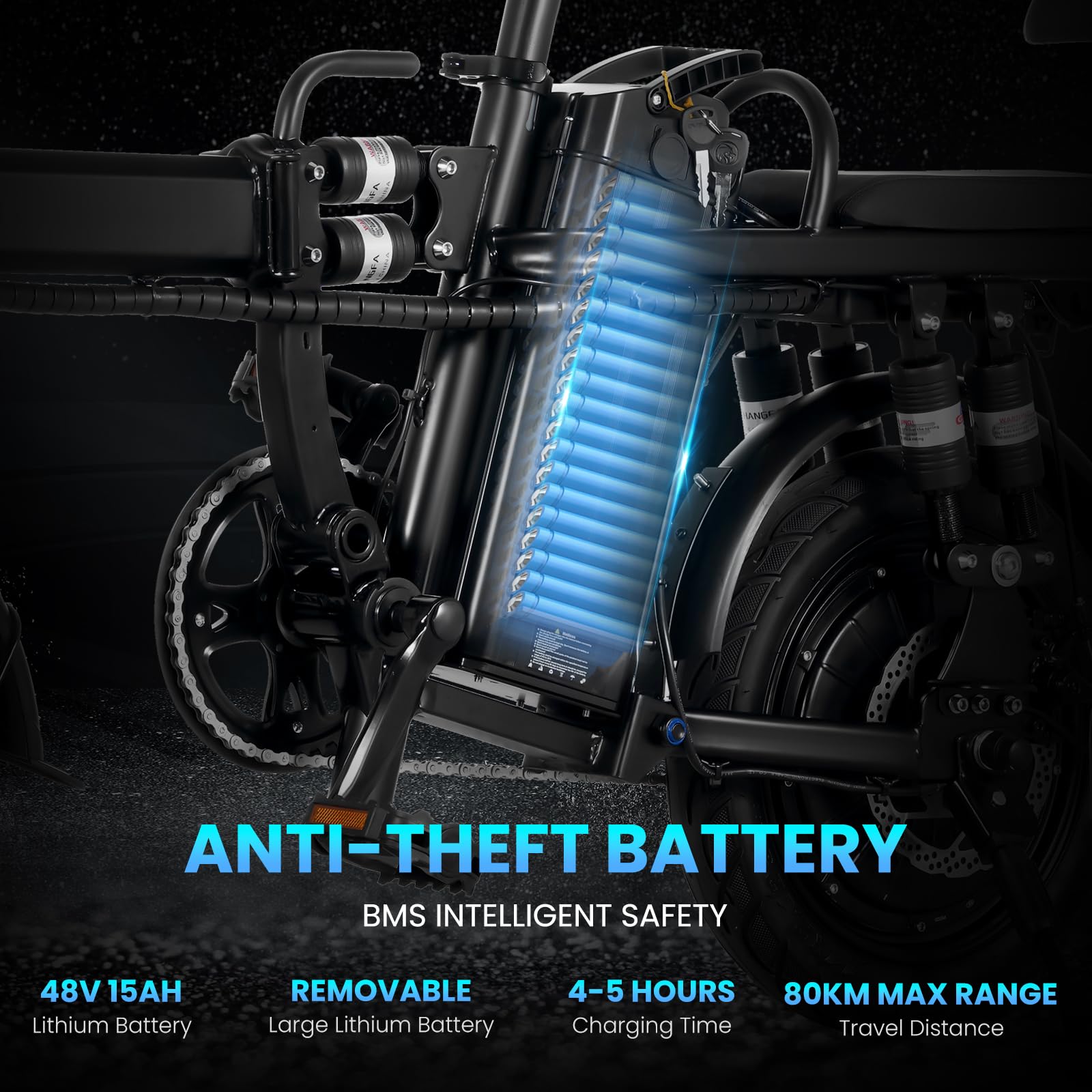 Certified 48V 15Ah Lithium Battery: Powered by a 48V 15Ah lithium battery, this electric bike with kids seat is easily removable for charging. It only takes 4-5 hours for a full charge, offering a range of up to 80 km (50 miles) in pedal mode and a top speed of 32 km/h (20 mph). This ensures you have the range and performance needed for daily rides.