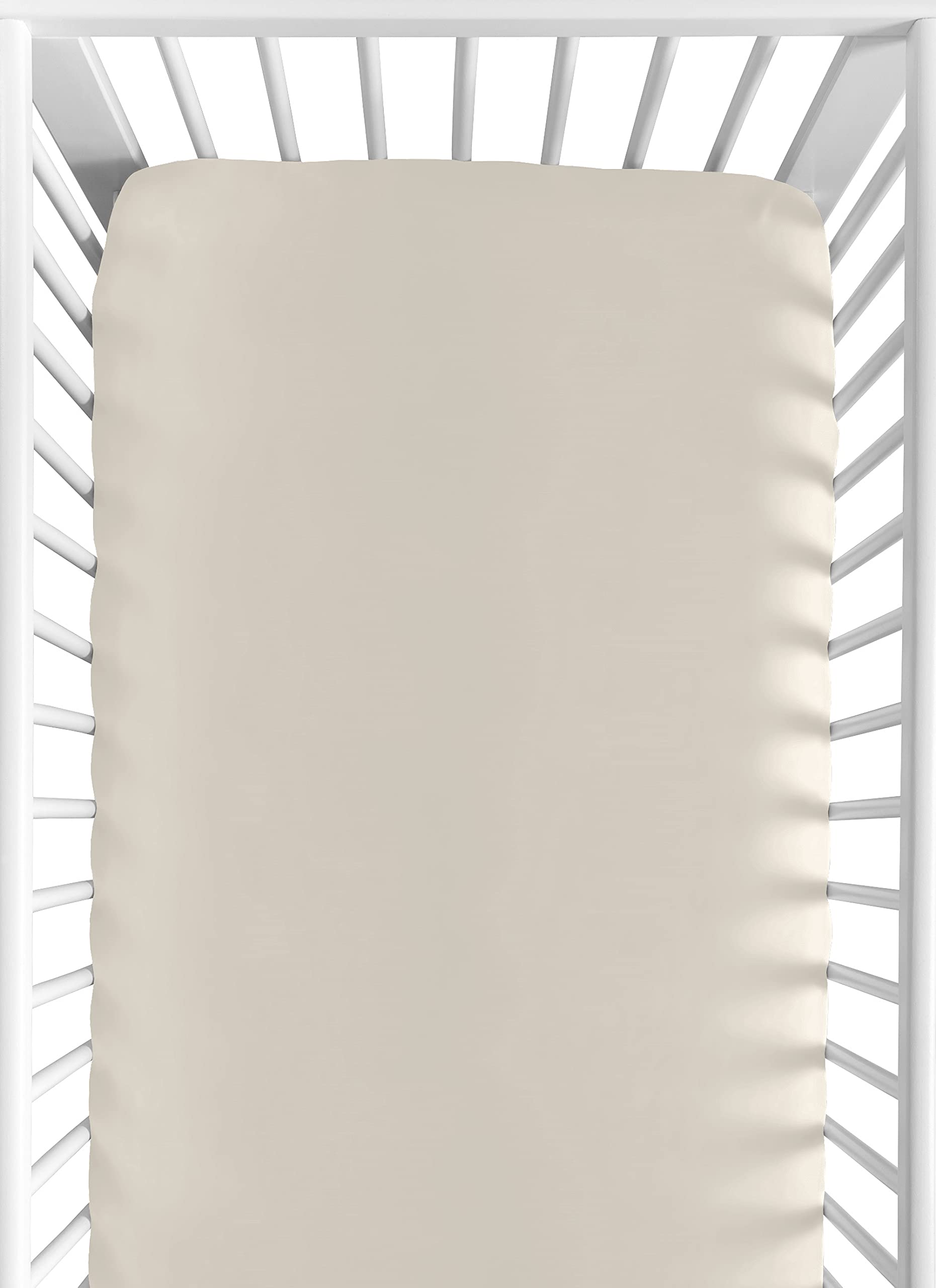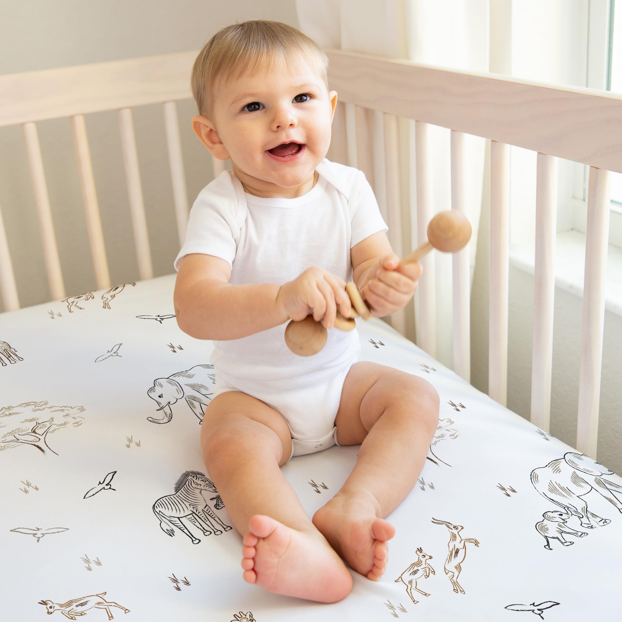 Pack of 2 Fitted Crib Sheets - (1) Brushed Microfiber Tan Beige Brown Black and White Jungle Safari Animals Elephant Giraffe Wildlife Adventure Zebra Elephants Animal Serengeti Print paired with (1) Cotton Solid Color Taupe Minimalist Print