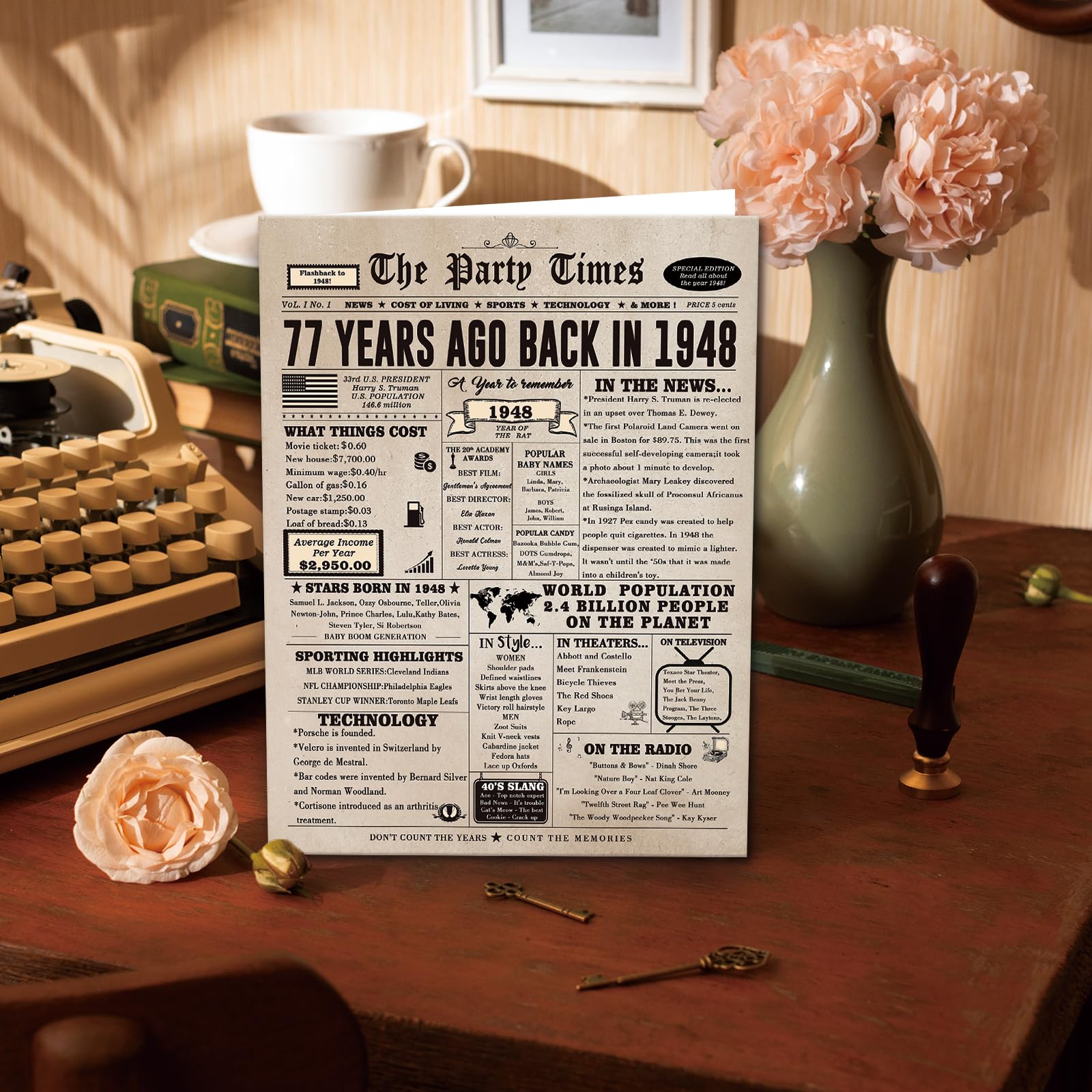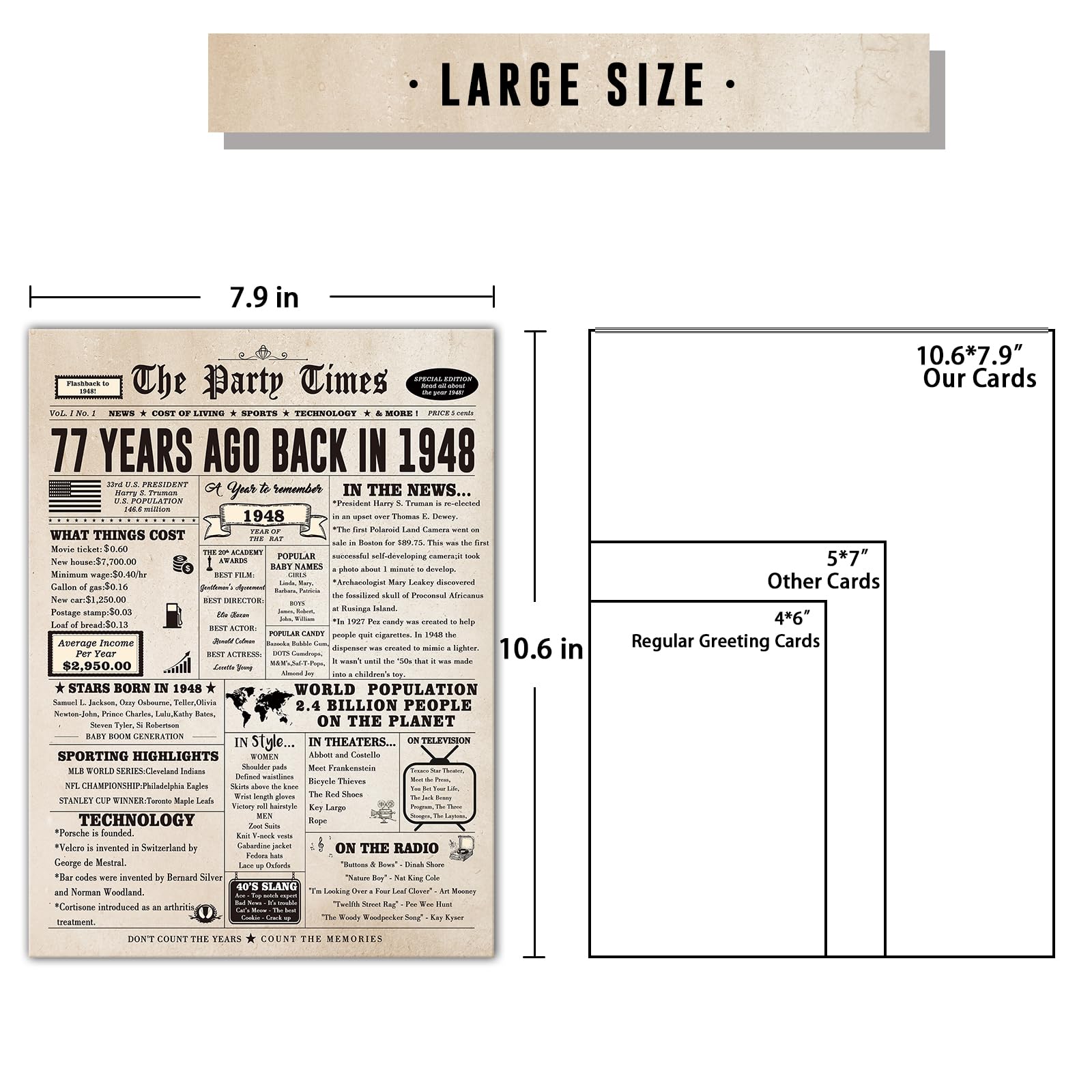 This large 77th birthday card features a vintage newspaper design, showcasing important events, movies and sports events from 77 years ago.