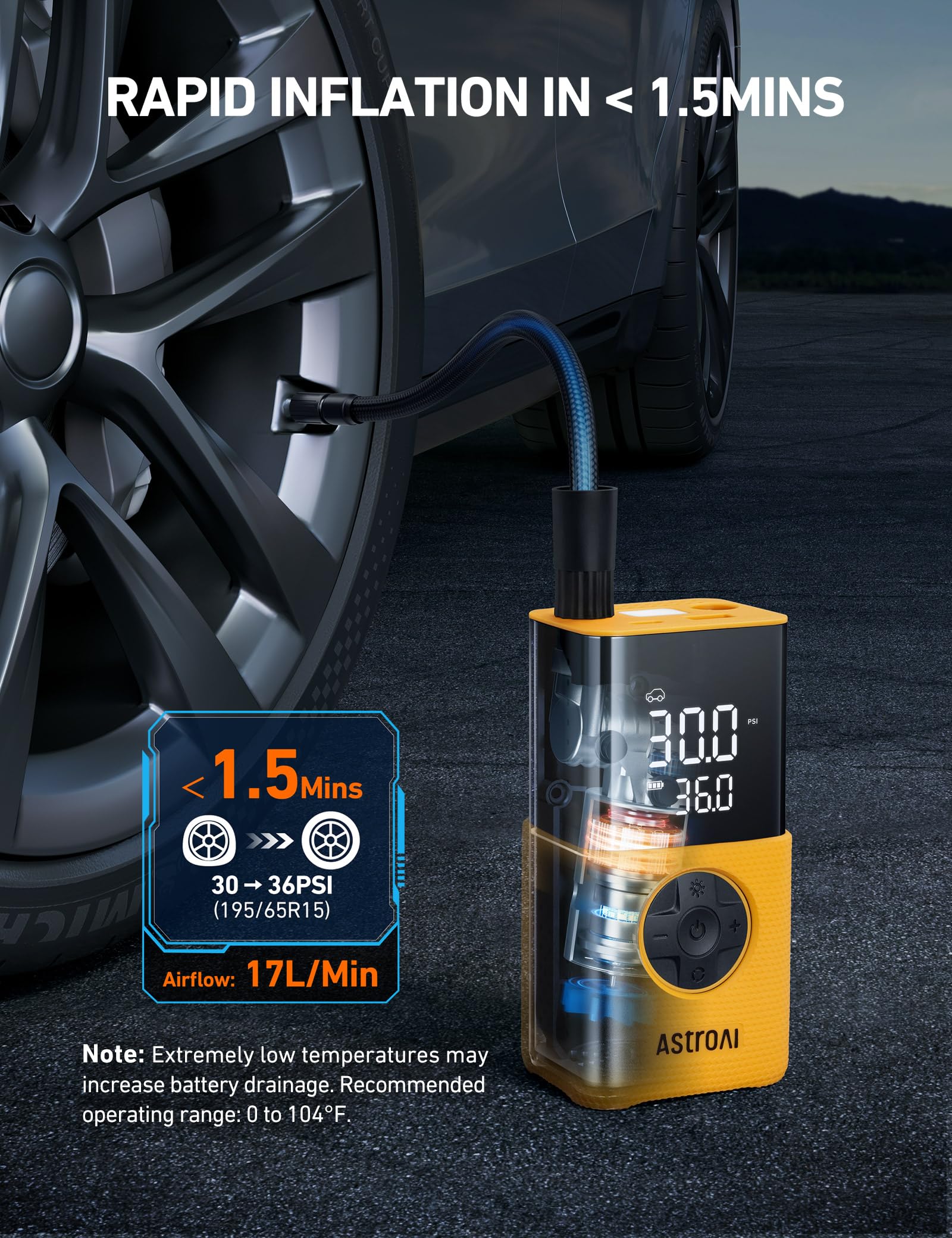 2X FASTER INFLATION & UNMATCHED PORTABILITY: The tire inflator’s 150 PSI maximum pressure, coupled with its 17L/min airflow delivers 2X faster inflation, can refill a 195/65R15 tire from 30 to 36 PSI in 1.5 minutes. Weighing only 1.01 pound(5.31*2.71*2.04 IN), this bike air pump is easy to carry and store in any limited space, such as car trunks, bike racks, or backpacks.