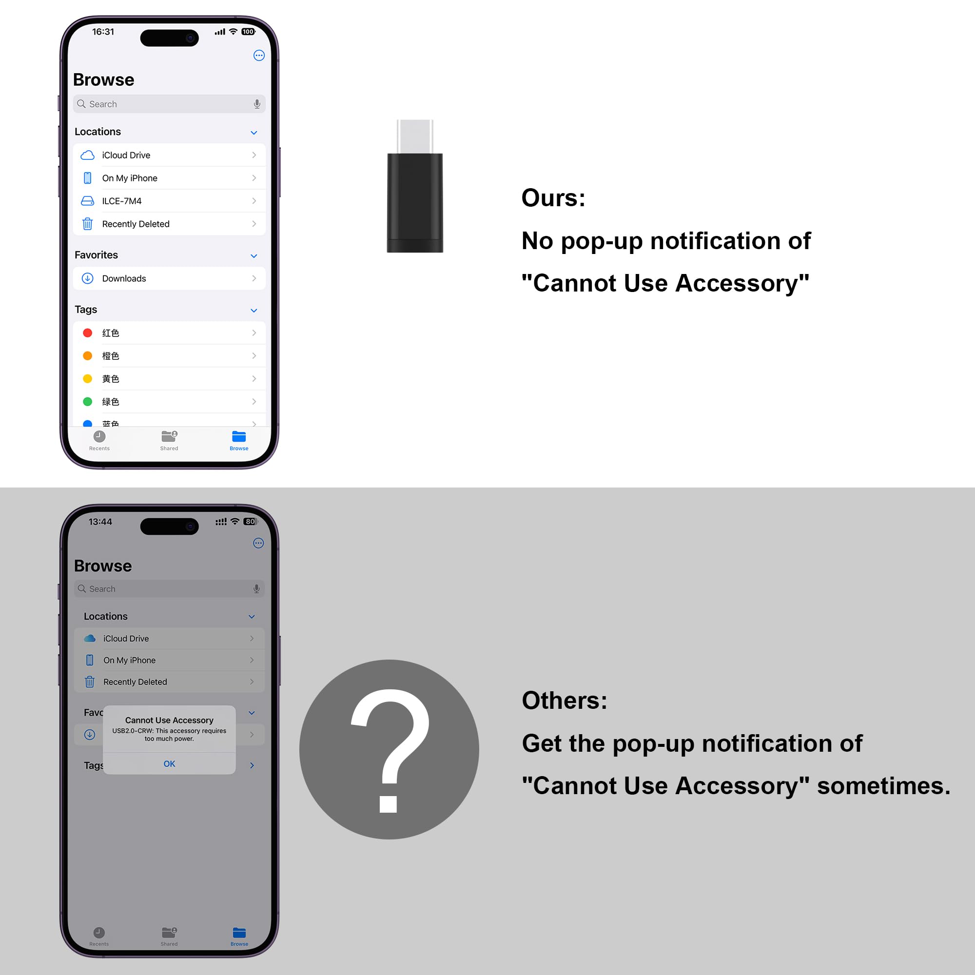 [The Female USB Interface]: Lightning to USB adapter has the Female USB Interface is a OTG Camera Adapter for iPhone &iPad, supports Digital camera, SLR Camera, The USB camera adapter does not require an application, and there is no need to remove the camera's memory card. You Can also plug the USB Flash Drive, Card reader, USB Headphone, Electric Guitar, MIDI keyboard, etc. (The maximum current of the peripherals does not exceed 500 mA). Not Support the Printer and Hard disk drive.