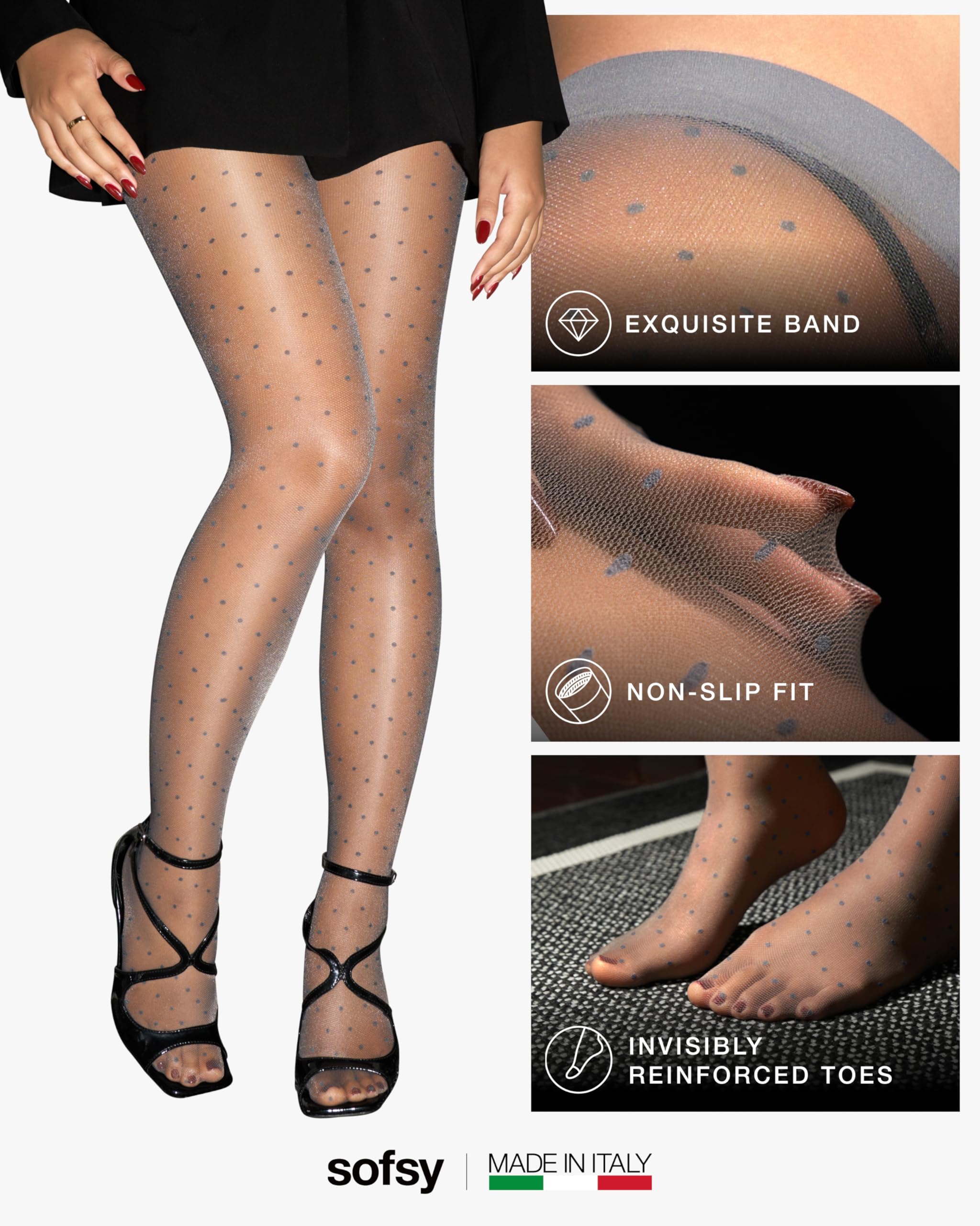 Made in Italy, Designed to Seduce: These sheer-to-waist pantyhose are crafted using silky-soft yarns and a playful polka dot pattern. They add just the right amount of allure to any outfit—whether for date night, office wear, or a festive occasion.
