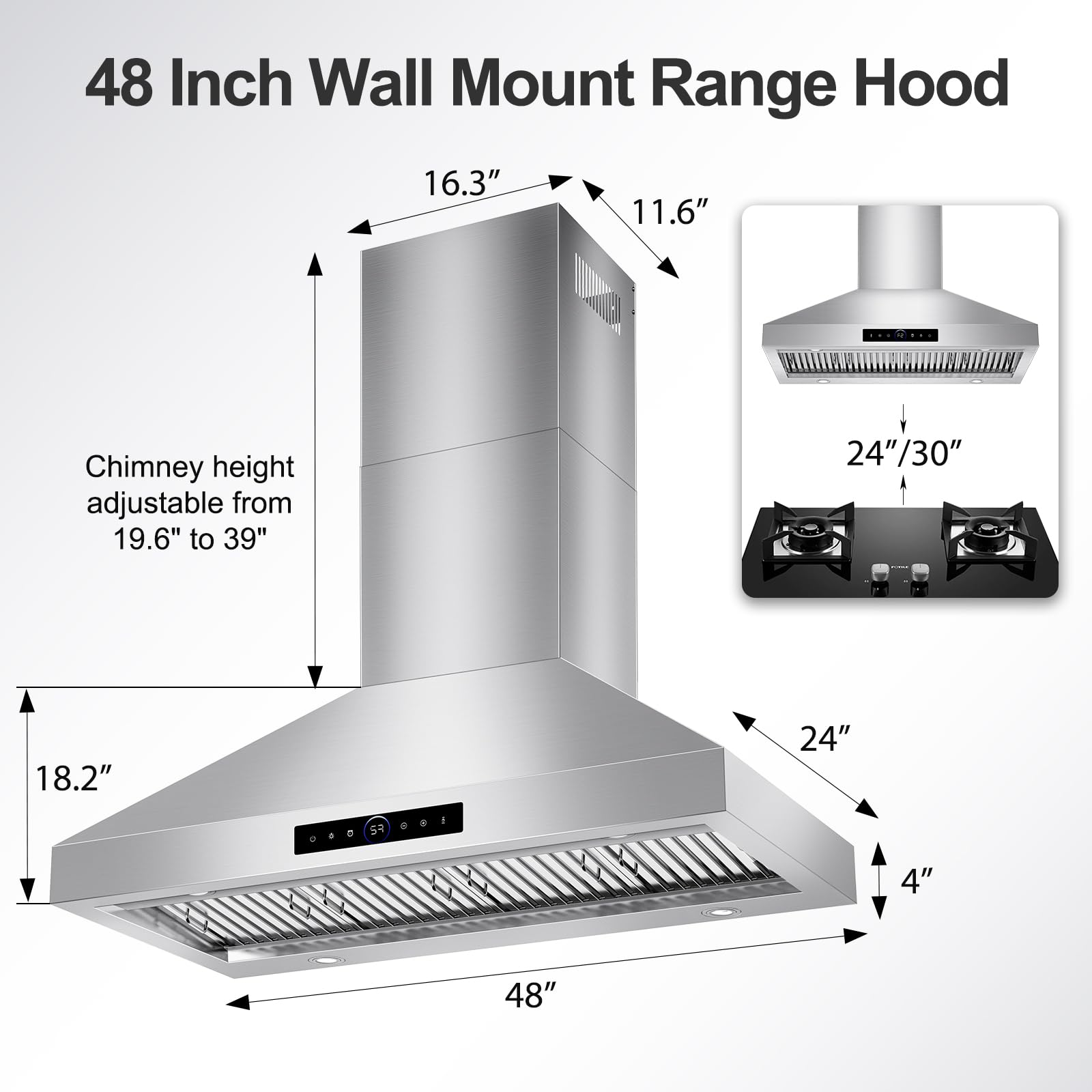 4 Powerful Wind Speeds and Adjustable LED Lights. This 48 inch range hood for kitchen equipped with four adjustable wind speeds, whether it is steaming, boiling, stewing, frying or grilling, it can effectively exhaust oil smoke, steam and odors, keep the kitchen air fresh, while saving energy and reducing cleaning troubles. 4 warm-toned LED lights provide soft and even lighting for your cooking area, and the brightness can be adjusted by pressing a button to create a warm and comfortable cooking atmosphere.