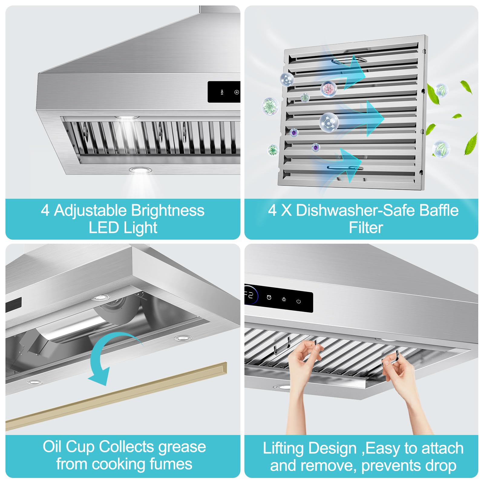 Machine-washable Stainless Steel Baffle Filters. The kitchen vent hoods equipped with two heavy-duty stainless steel baffle filters, they are heat-resistant and rust-resistant, and can effectively capture grease and impurities. The filters are easy to disassemble and reassemble, and can be directly put into the dishwasher for maintenance-free, long service life, and easy to create a clean kitchen.
