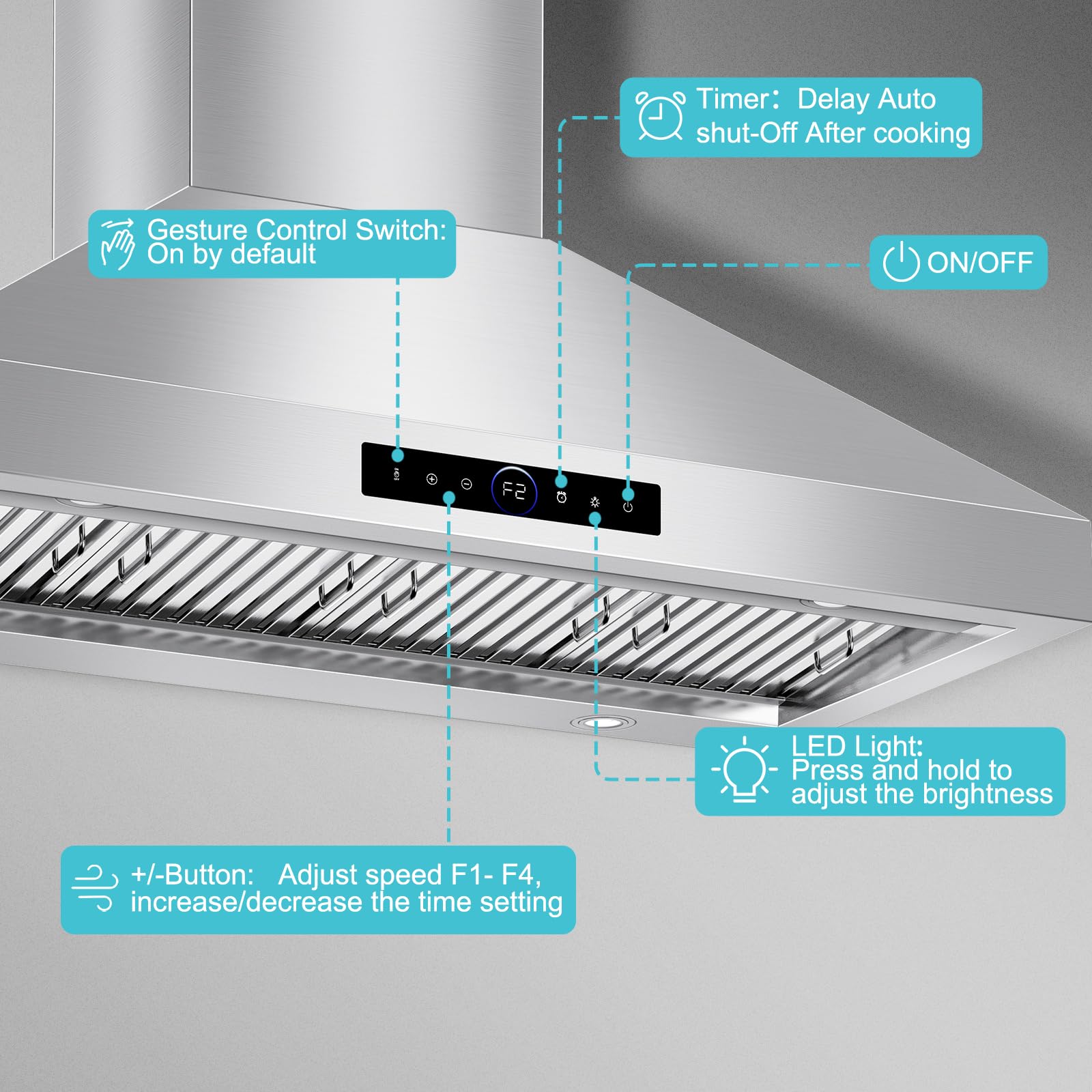 Touch & Gesture Control. This stylish and durable stainless steel under cabinet range hood combines modern elegance with smart features. The intuitive digital touchscreen allows for quick adjustments, and advanced gesture sensing technology allows you to precisely adjust the wind speed with a wave of your hand, with smooth operation and effective avoidance of accidental touches.