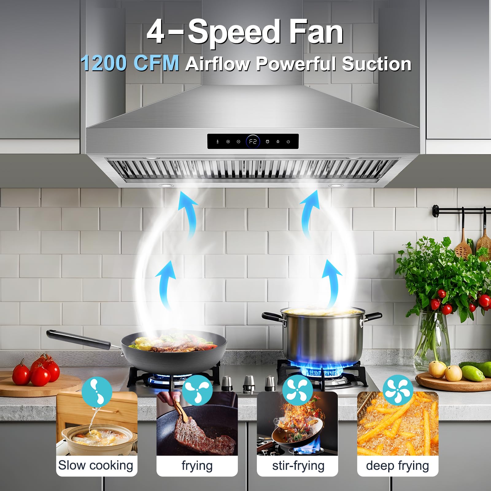 1500 CFM Powerful Suction Quickly Removes Smoke and Odors. RAPSUAR kitchen exhaust hood equipped with dual centrifugal motors, it provides powerful airflow up to 1500 CFM, effectively capturing and exhausting oil smoke and odors from all directions and quickly exhausting them, so that you can always breathe fresh air during the cooking process and keep the kitchen clean and comfortable.