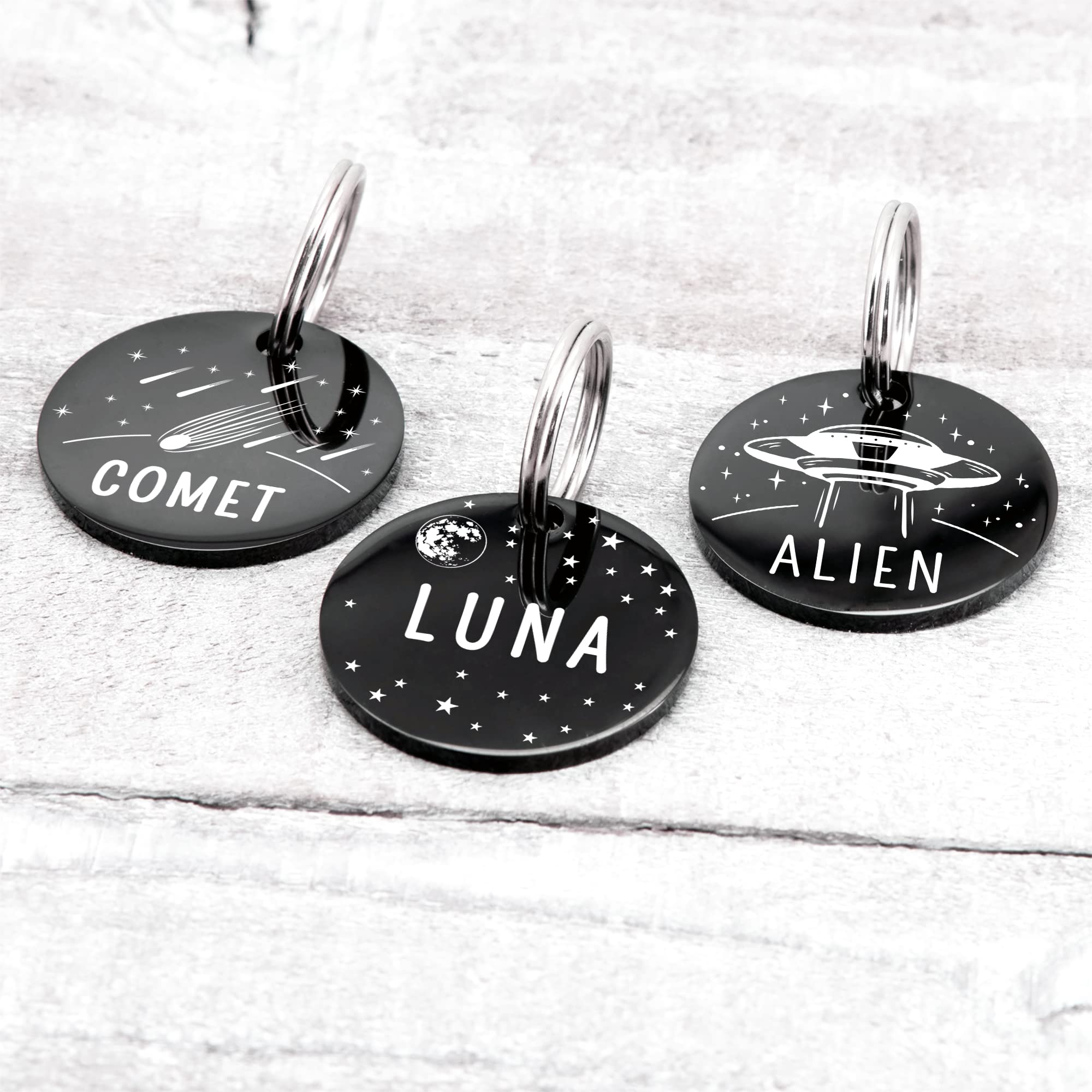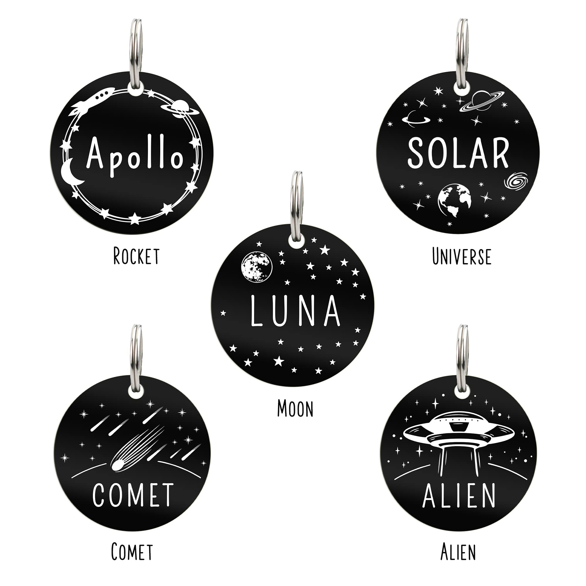 ROUND SHAPE PET NAME TAG SIZE - The small size round shape dog tag is measured 1 inch diameter, it is designed for pets below 40 lbs. The large size bone shape dog tag is measured 1.2 inches diameter, it is designed for pets over 40 lbs.