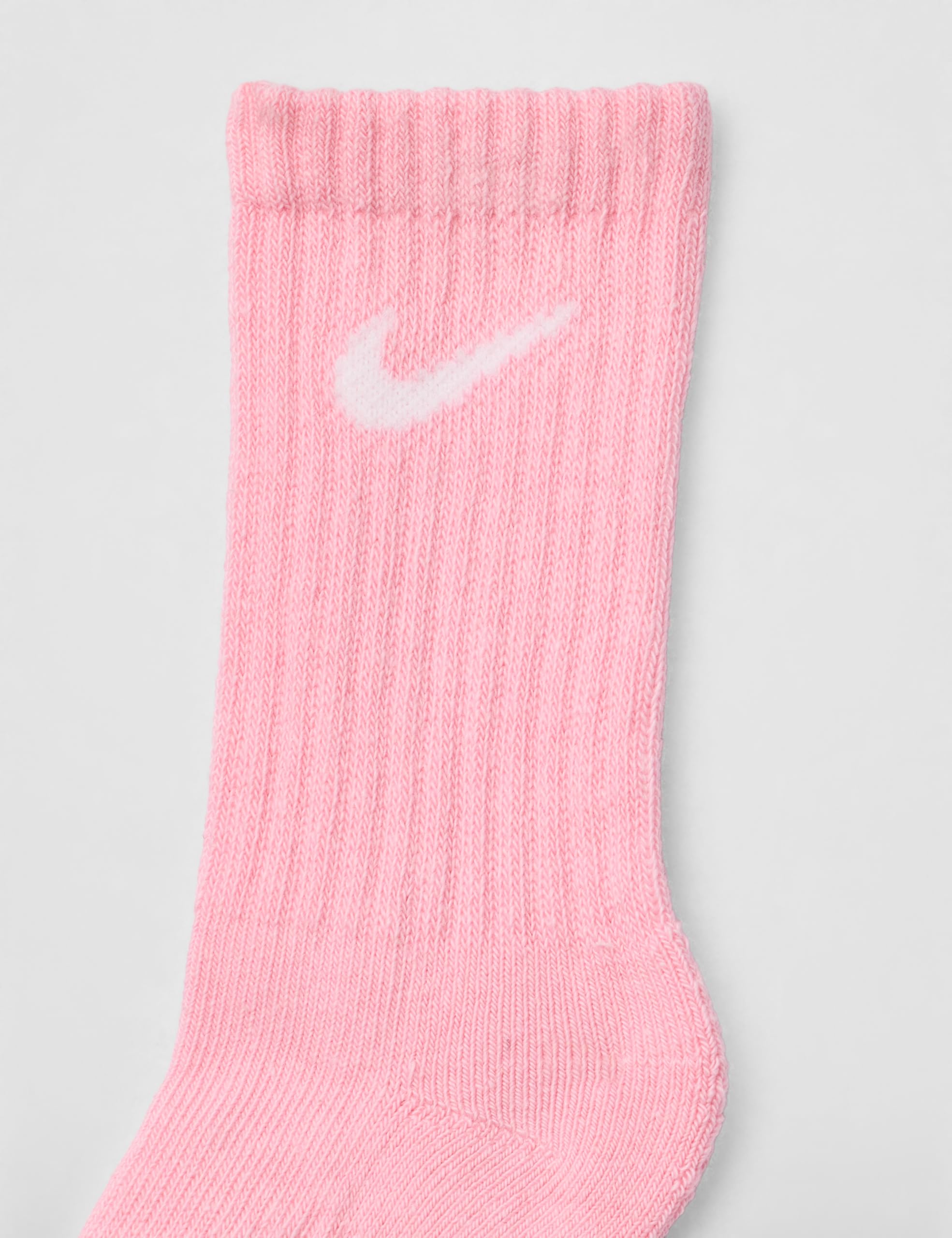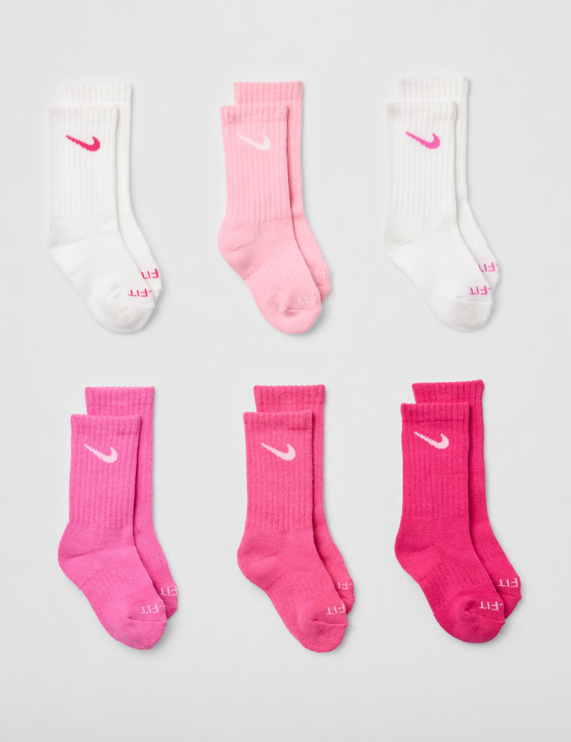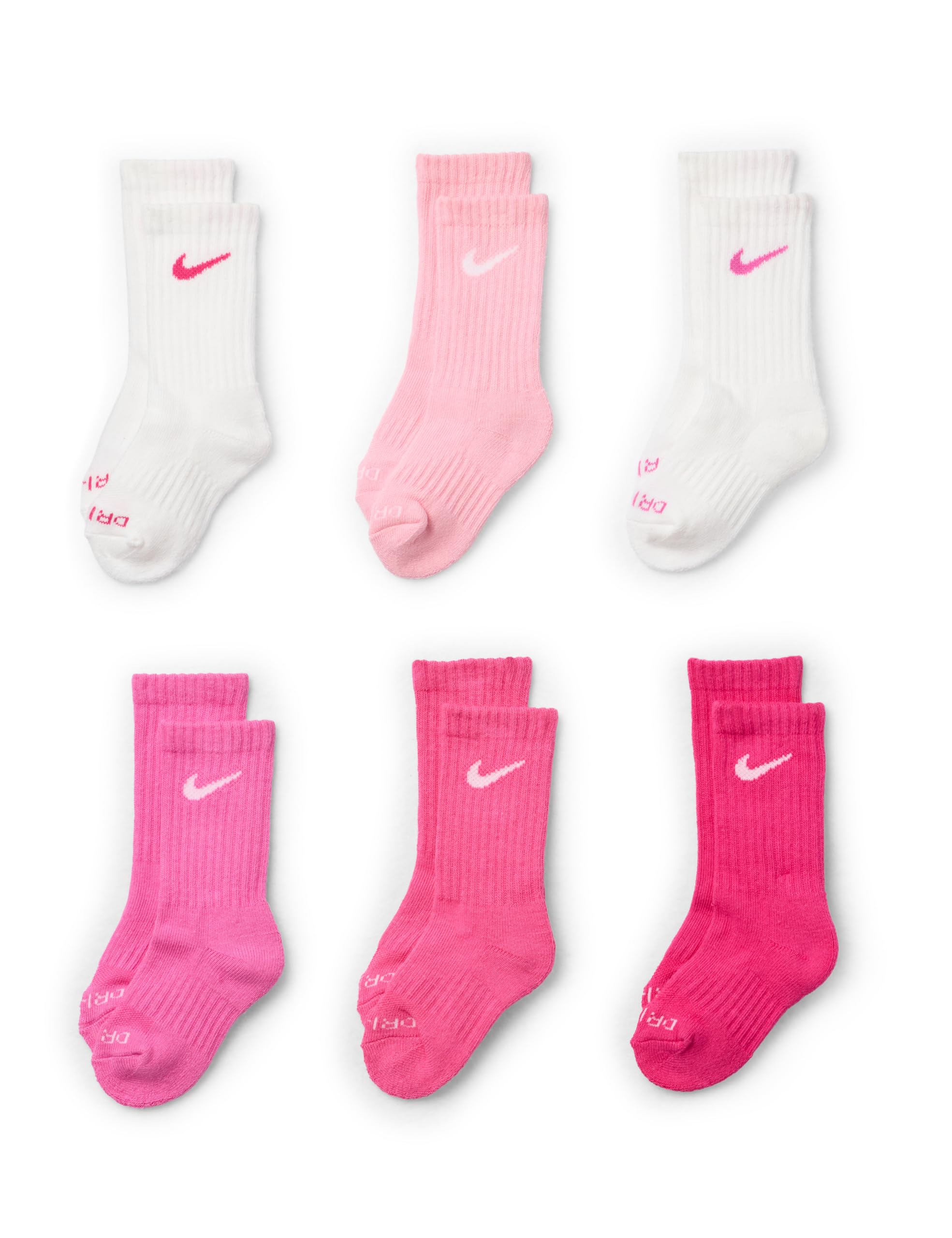 Description Supportive footwear begins with what's inside your shoes, and this 6-pack of Nike Performance Basic Crew Socks provide lots of support while complementing your Nikes. The socks are made of a soft cotton/poly blend in a flat knit construction with a breathable mesh upper, the ribbed arch support band helps with balance, and to prevent or relieve pain. Comfy cushioning on the bottom, heel, and toe helps absorb impact during your every run, jump, and skip while Dri-FIT technology wicks away moisture from skin and is quick-drying to help keep your feet cool and dry while you move, making these socks not only great for sport and play, but great for every day, all day. The classic crew silhouette is a great way to complement your kicks your fit, with the ribbed cuffs helping to secure the fit.