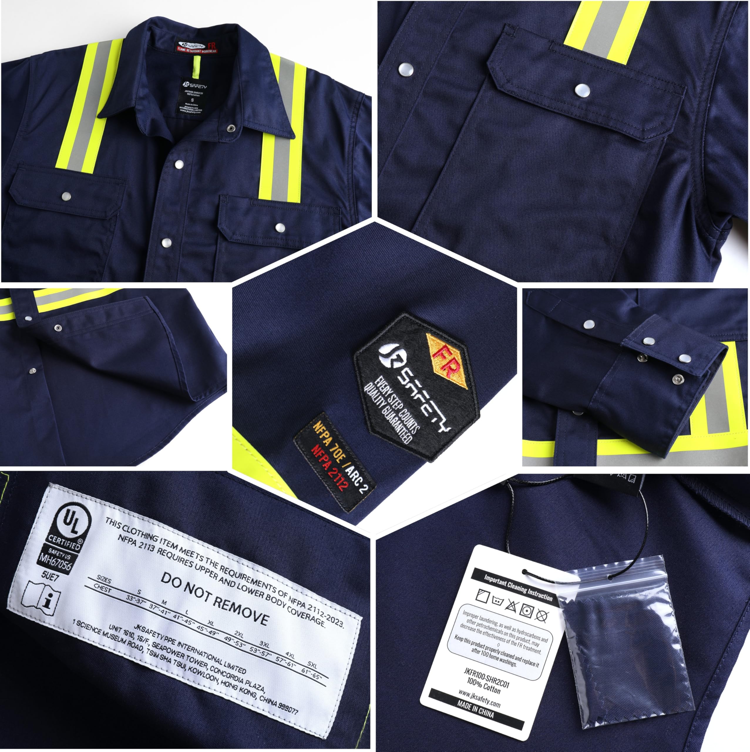Flame Resistant Shirts: The JKSafety 7oz 100.00% cotton FR long sleeve shirts for men is crafted from durable FR fabric; The fr shirts resists fire without dripping or melting. The FR Clothing complies with an ARC Rating of CAT 2, certified by UL for reliable flame-resistant performance. They offer protection for men and women safety in high-risk environments exposed to sparks, flames and heat. Note: A small FR garment sample have been attached for inspection.