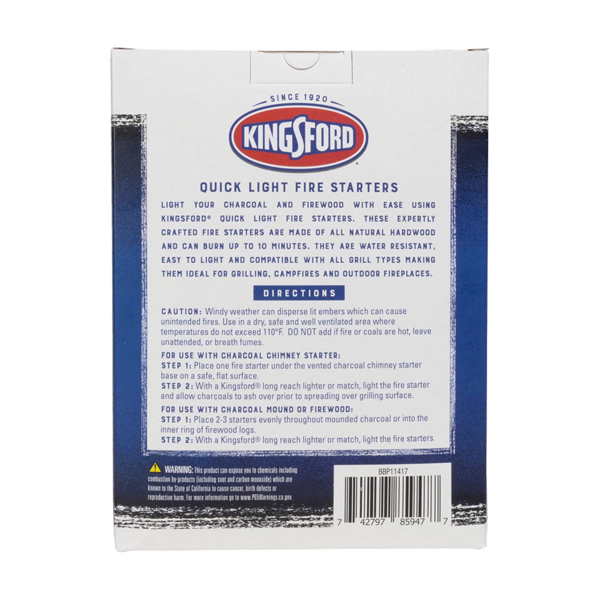 Light your charcoal & firewood with ease using Kingsford Quick Light Fire Starters. These expertly crafted fire starters are made of all natural hardwood and can burn for up to 10 minutes. They are water resistant, easy to light & compatible with all grill types making them ideal for grilling, campfires & outdoor fireplaces. Directions: For use with charcoal chimney starter: Step 1: Place one fire starter under the vented charcoal chimney starter base on a safe, flat surface. Step 2: with a Kingsford long reach lighter or match, light the fire Starter & allow charcoals to ash over prior to spreading over grilling surface. For use with charcoal mound or firewood: Step 1: Place 2-3 starters evenly throughout mounded charcoal or into the inner ring of firewood logs. Step 2: with a Kingsford long reach lighter or match, light the fire starters. Caution: Windy weather can disperse lit embers which can cause unintended fires. Use in a dry, safe & well ventilated area where temperatures do not exceed 110A° Fahrenheit. Do not add if fire or coals are hot, leave unattended, or breath fumes. Kingsford & logo are registered trademarks of the Clorox Company & are used under license by Brand Buzz LLC. All rights reserved.Grill liners from Kingsford grilling include veggie grillers, fish grillers, meat grill liners, and so many other types of grilling liners. Foil products like kingsford foil grilling products are strong, durable, heavy duty, and great grill accessories. There are even charcoal smoker accessories that make great grill sets for men. Using Kingsford will make you almost like the pit boss, giving you all the pit boss accessories.YOUR SATISFACTION IS OUR PRIORITY- If you have any questions or feedback, please reach out to us directly at Brand Buzz CP.