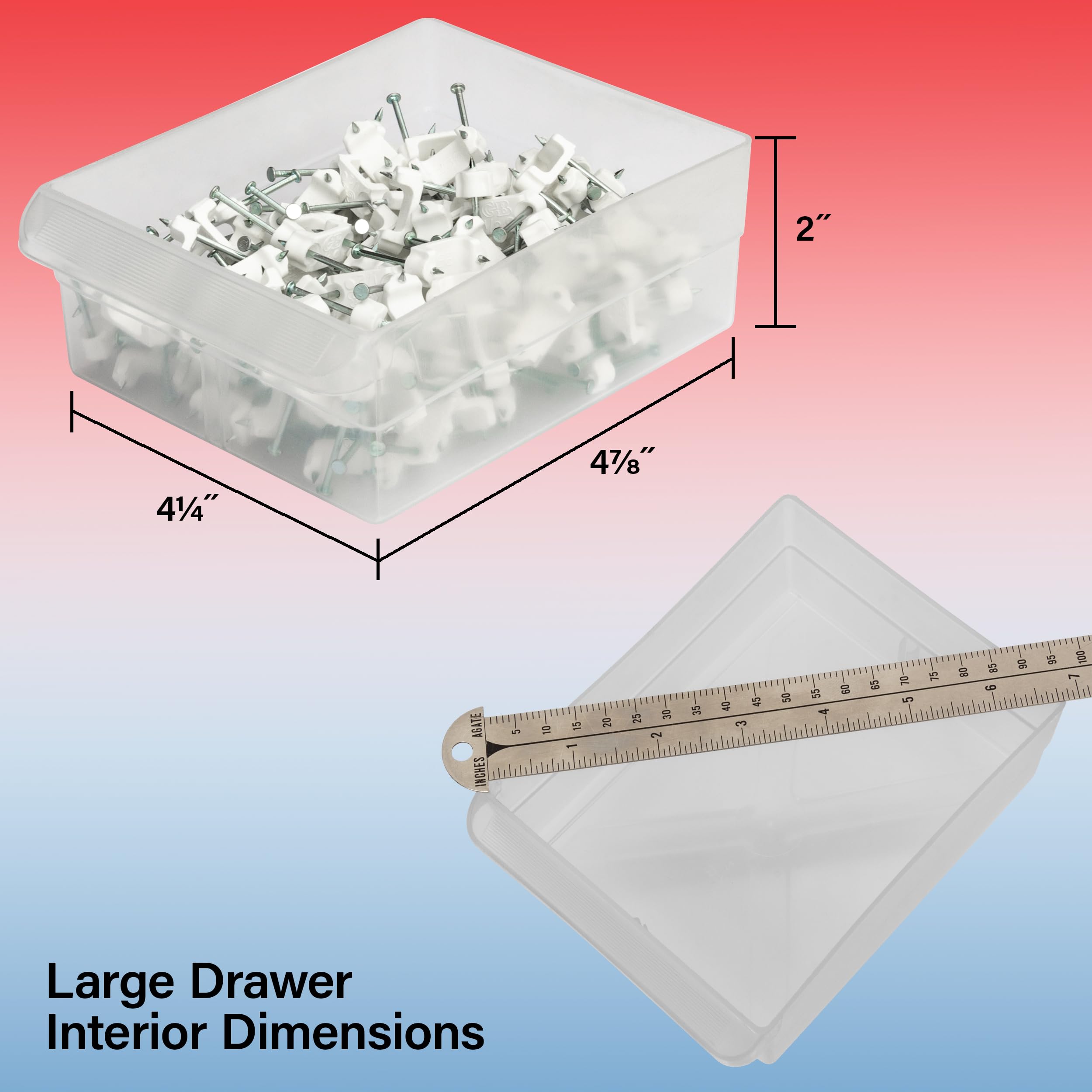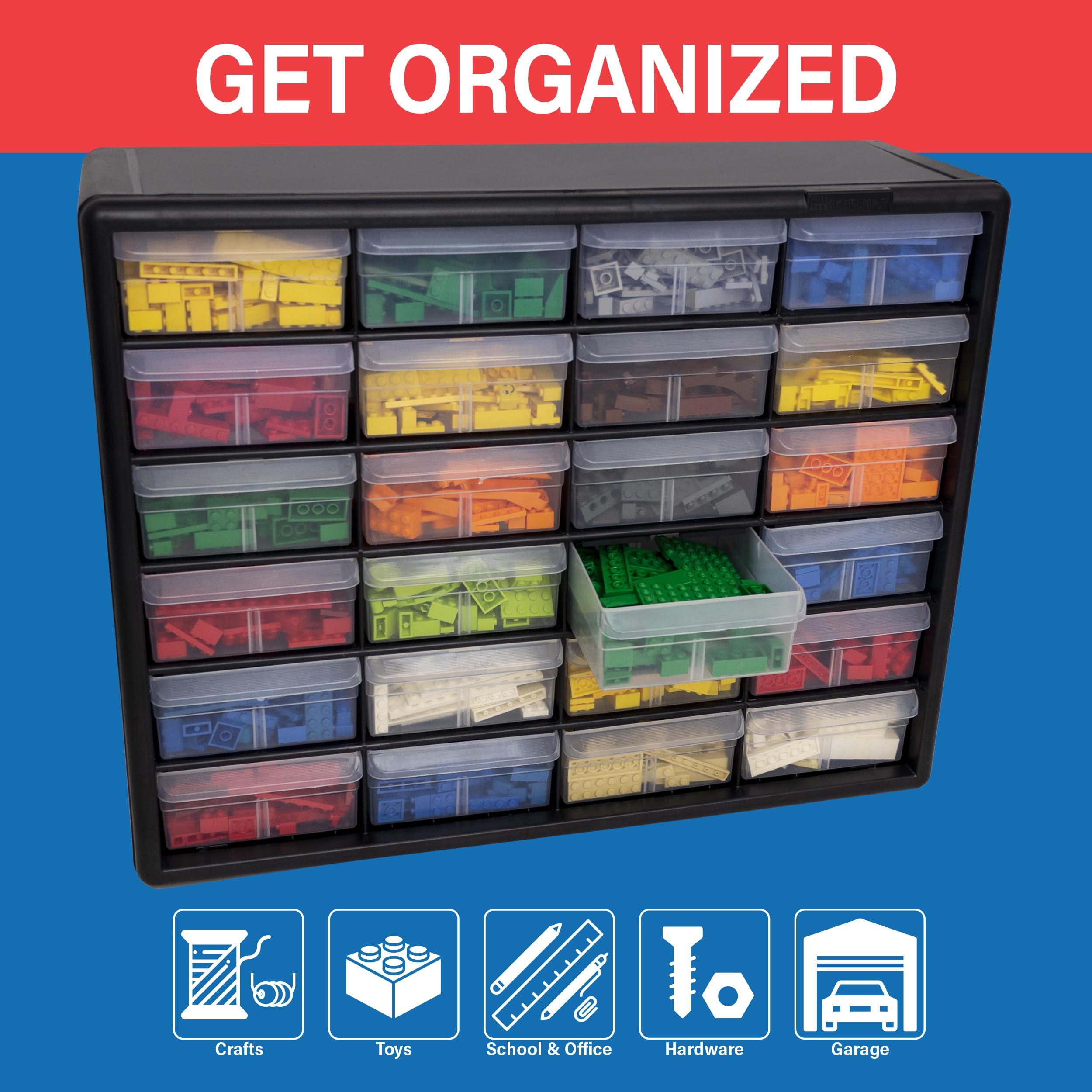 Product Description The Akro-Mils 10124 24-Drawer Plastic Storage Cabinet Organizer with Drawers is a great solution for all your storage needs. This heavy-duty cabinet is made in the U.S.A. from rugged, high-impact polystyrene plastic and features 24 large and small plastic drawers offering ample storage space for all your small parts and tools. Plastic organizer drawers inside dimensions: 4-7/8-Inch x 4-1/4-Inch x 2-Inch. Whether you're looking to organize your garage, workshop, classroom, or home, this storage cabinet has you covered. Garage owners and businesses will love the versatility of this cabinet, with the plastic storage drawers perfect for use as a hardware organizer, screw organizer box, or for battery storage. Keep your nails and other small parts accessible with ease. Teachers can use the cabinet for classroom storage, as a teacher toolbox, art storage, craft storage box, for scrapbook supplies, and more. This plastic storage cabinet is also perfect for home storage and organization. Use it as a lego organizer, craft organizer, hobby organizer, or bead storage organizer. It's even great for makeup storage and organization or for medicine and first aid supplies. And with the ability to stack cabinets securely or wall-mount them using keyhole slots, along with finger-grip drawer pulls and rear stop tabs to prevent contents from spilling, this cabinet has everything you need to keep your items safe and organized. Cabinets have 8 small crosswise dividers and 4 large length dividers included. Included dividers are molded into the back of the cabinet (remove with scissors). Additional dividers can be purchased separately. From the Manufacturer 10124 Cabinet stacks securely and can also be wall mounted with keyhole slots. Clarified polypropylene, dividable drawers offer easy content identification. Finger-grip drawer pulls provide easy access and rear stop tabs prevent contents from spilling. Akro-Mils products save time and money by helping to increase material handling efficiency in virtually any industry. Our broad range of storage, organization and transport products are used to shorten assembly times, maintain accurate inventories, optimize storage space and improve parts protection. Our mission at Akro-Mils is a commitment to manufacturing innovative storage and material handling products of uncompromising quality at a fair price. We support this commitment with professional representation and consistent, superior service to meet the needs of our customers. For quality products backed by more than 60 years of reliable delivery and responsive customer service, we invite you to turn to the Akro-Mils advantage