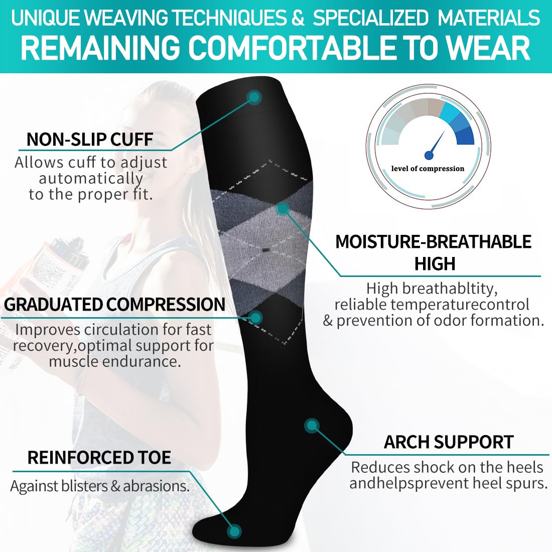 Ture Graduated Compression-Graduated compression is the most effective form of compression, and works differently than regular compression socks. Work by creating a 'pressure gradient' which helps to push oxygen-poor blood out of the feet and legs, and back to the heart. This improves circulation, boost energy levels, and relieves symptoms such as aches and pains, throbbing, swelling, blood pooling, provides the renewable and sustained energy and allows you to heal in the legs and feet.