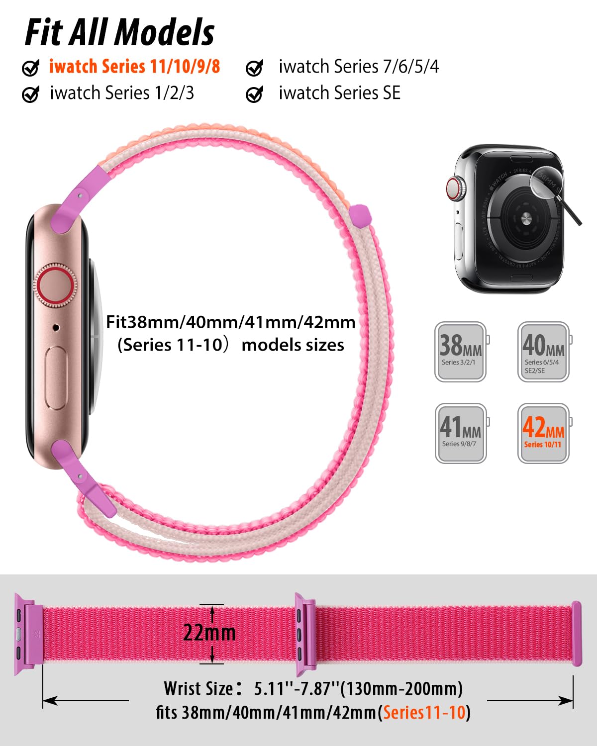 [Fit All Models]: Sunnywoo sports nylon watch bands - Compatible with apple watch for women and men, Fits all apple watches, iWatch Bands for Se, Ultra 3/2/1, Series 11, Series 10, Series 9, Series 8, Series 7, Series 6, Series 5, Series 4, Series 3, Series 2, Series 1, iWatch wrist straps offer two size options, ① 5.11"–7.87" (130–200mm) fits 38/40/41/42mm cases ② 5.51"–8.66" (145–220mm) fits 44/45/46/49mm cases. Please check the size on the back of the watch and choose the right size
