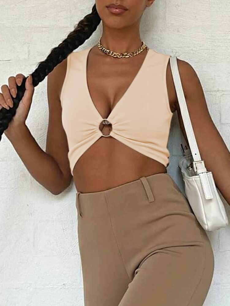 Design of the deep v neck and the silver ring center piece keeps the y2k top away from the ordinary. This cute tops can go well with jeans, shorts and high heels well
