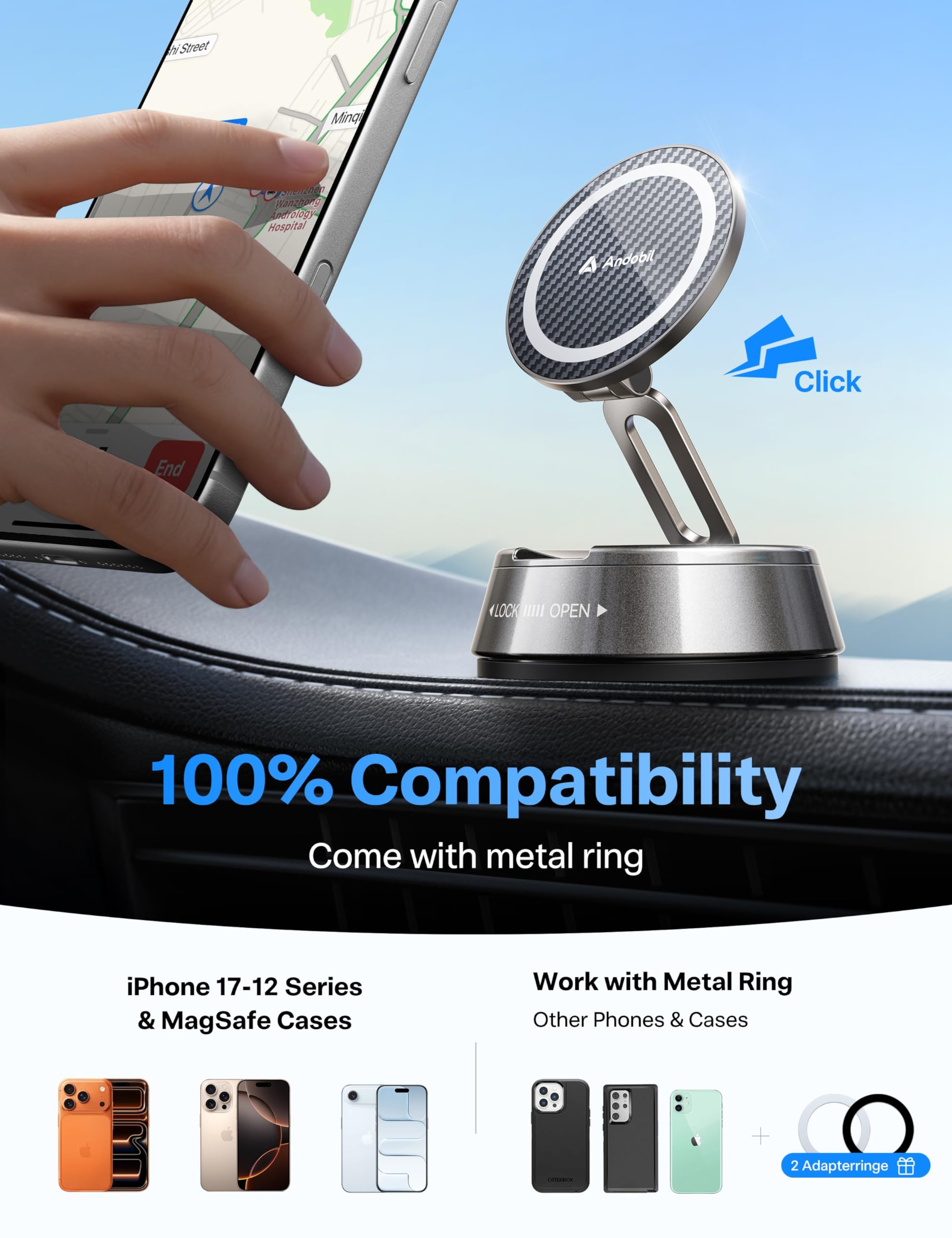 Not compatible with suede, genuine leather or coated textured surfaces โ only for flat, smooth & non-textured surfaces for optimal adhesion. For repositioning the suction cup: simply rinse it with clean water, let it air dry completely, then reattach for like-new strong suction. Bonus Note: andobil includes extra metal rings for universal use, which can be affixed to your phone or phone case if your device does not support MagSafe.