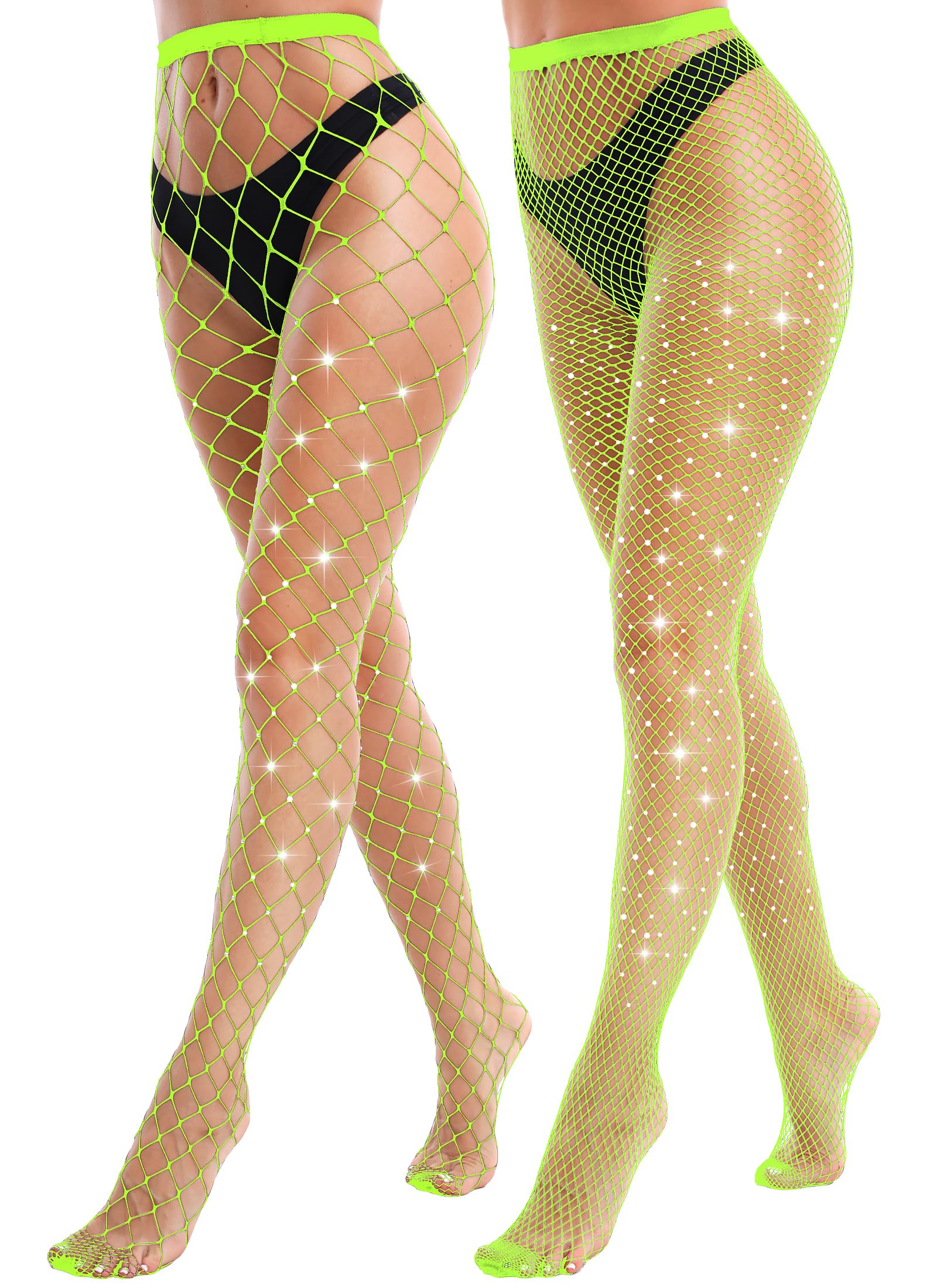 Package Include: 2 Pairs of High Waist Sparkly green Fishnet Tights with two Types, Large mesh and Middle mesh.