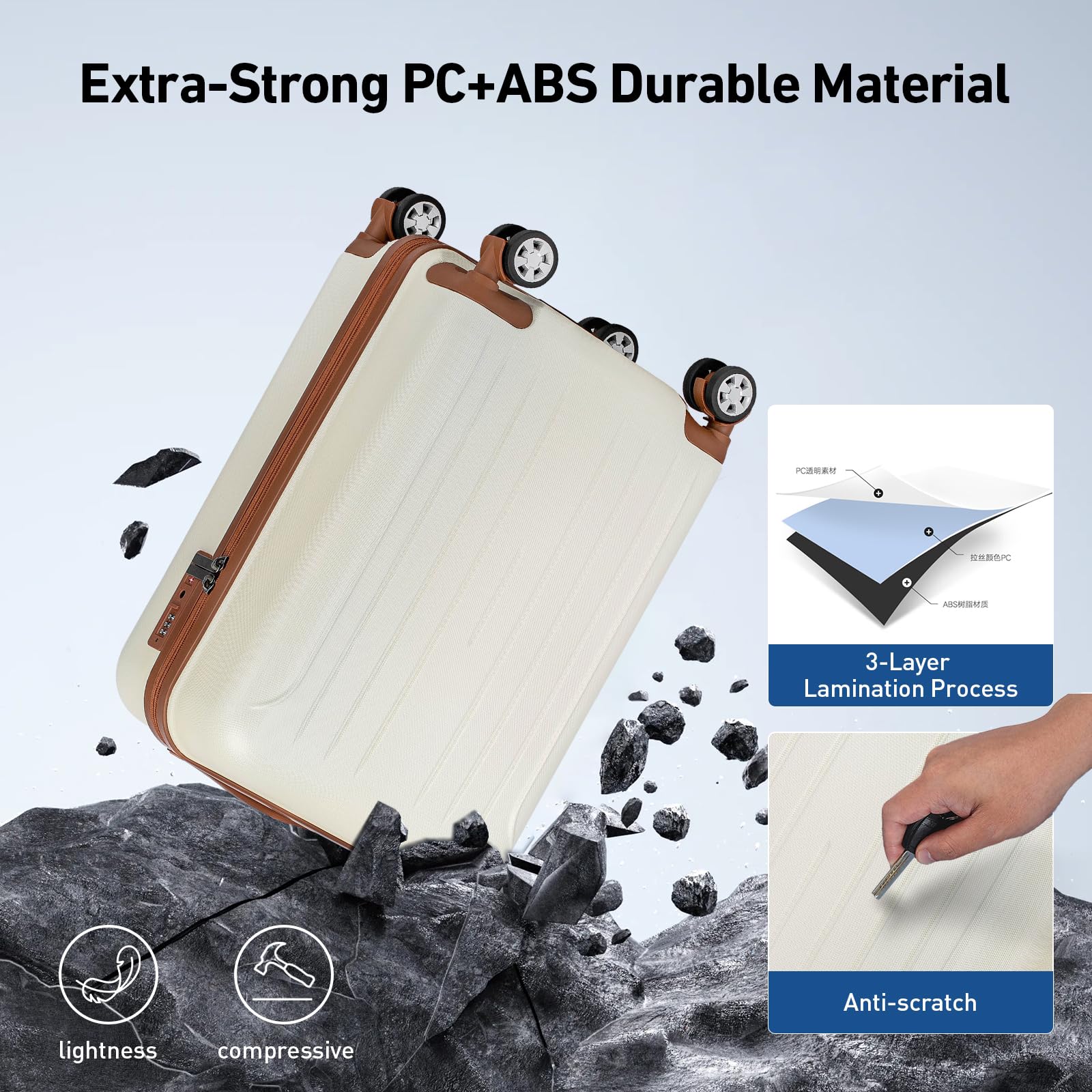 Lightweight Yet Unbreakable: Crafted from premium PC+ABS material, this suitcase is featherlight yet tough enough to withstand extreme temperatures (40-50℃) – because your adventures shouldn’t have limits!