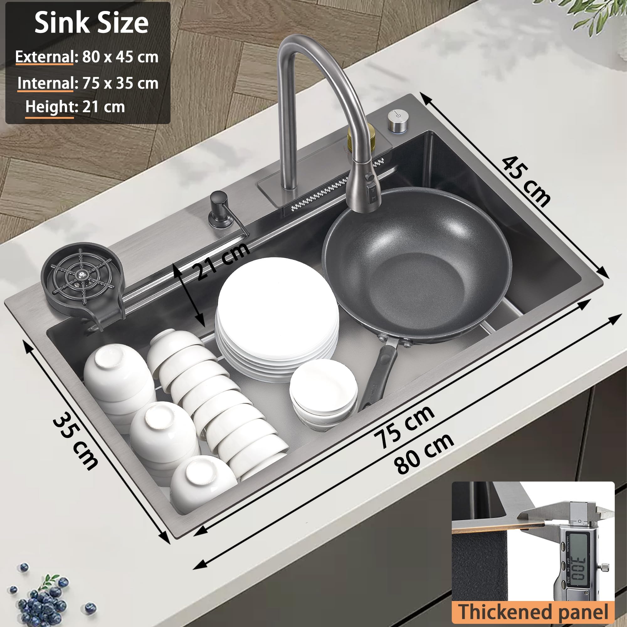 【Unique Faucet Design】The waterfall kitchen sink comes with a dedicated pull-out faucet, allowing easy operation within a flexible range of 60 cm extension. Four cleaning modes (stream, spray, rinse, waterfall) cater to various water usage needs. A knob switches between faucet and waterfall modes, ensuring simple and convenient operation.