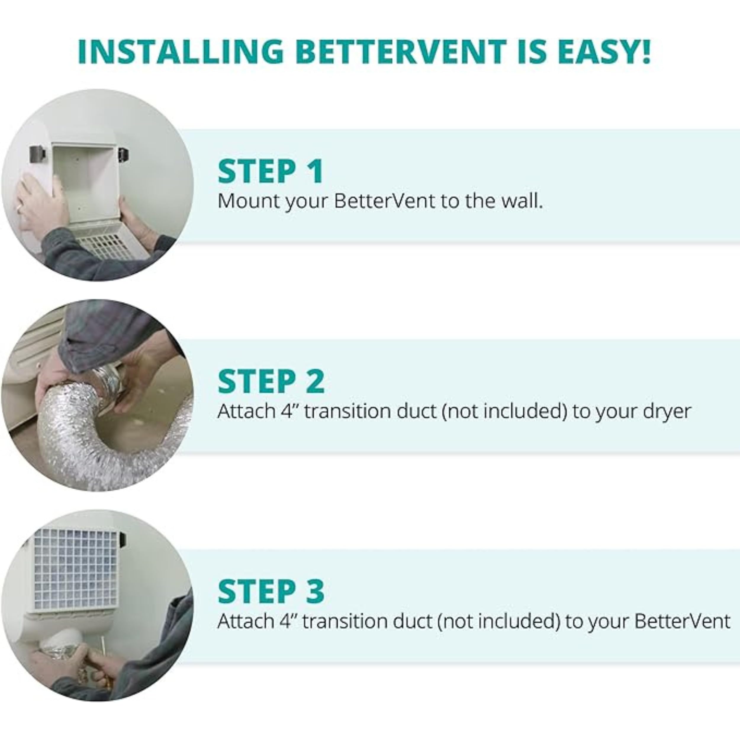 SUPERIOR QUALITY DRYER VENT KIT β Capture lint, dust, pet hair and more with the energy-efficient, cost-saving BetterVent indoor dryer vent kit for electric dryer. With a stainless steel pre-filter screen and a polyester filter, this high-quality dryer vent kit traps the finest dust particles. Perfect for renters and homeowners, this double filter system ensures a healthy indoor environment.