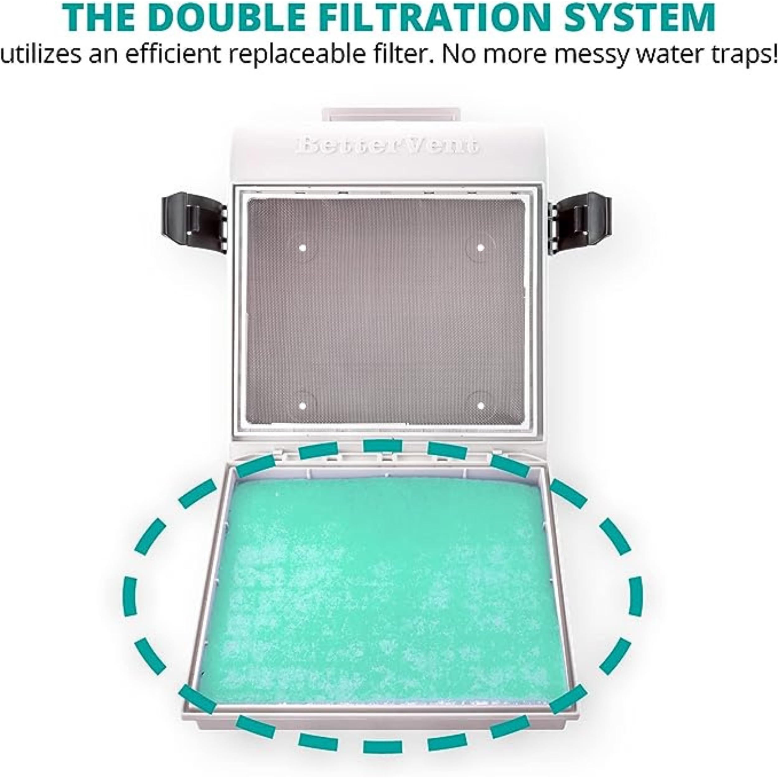 NO WATER NEEDED & ENERGY EFFICIENT β The BetterVent patented double filter system has no water requirement, eliminating messy cleanups. Do we really want a messy water bucket in our air filter? This type of setup leads to unwanted growth, M@LD. Dry clothes faster and increase savings in colder months by returning warm dryer air into the room.