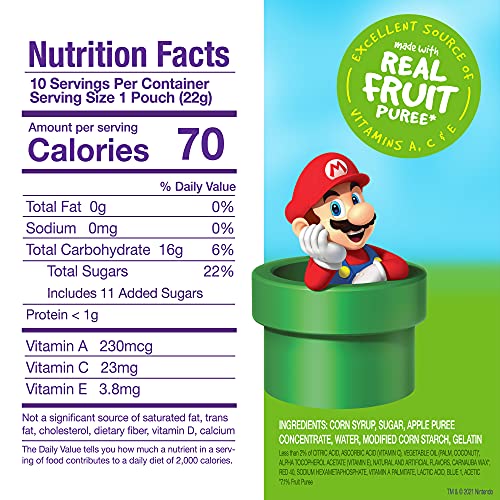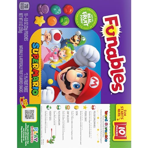 Embark on a flavorful journey with Funables fruit flavored snacks, inspired by the iconic Super Mario universe. Each box includes an assortment of ten individually wrapped 0.8 oz packs of fruit flavored snacks featuring beloved characters like Mario, Luigi, and Princess Peach. Take your pick. Every bag has a variety of fruit-flavored snacks inside waiting to be picked by you. These fruit flavored snacks are made with 7.1% real fruit puree. The fat free fruity snacks are also an excellent source of Vitamin A, C, and E and are only 70 calories per pouch. Enjoy them in a lunch box or on-the-go. Reach for these fun treats any time you crave some berry good fruity snacking. The Funables fruit flavored snack range brings you flavor-packed fun. In vibrant, fruity flavors, these fruity snacks are ideal for road trips, going to the movies or giving as a gift to your favorite people. Have fun and eat it too with Funables fruit flavored snacks. Convenient for everyone, Funables makes snacking easy at any time and anywhere.
