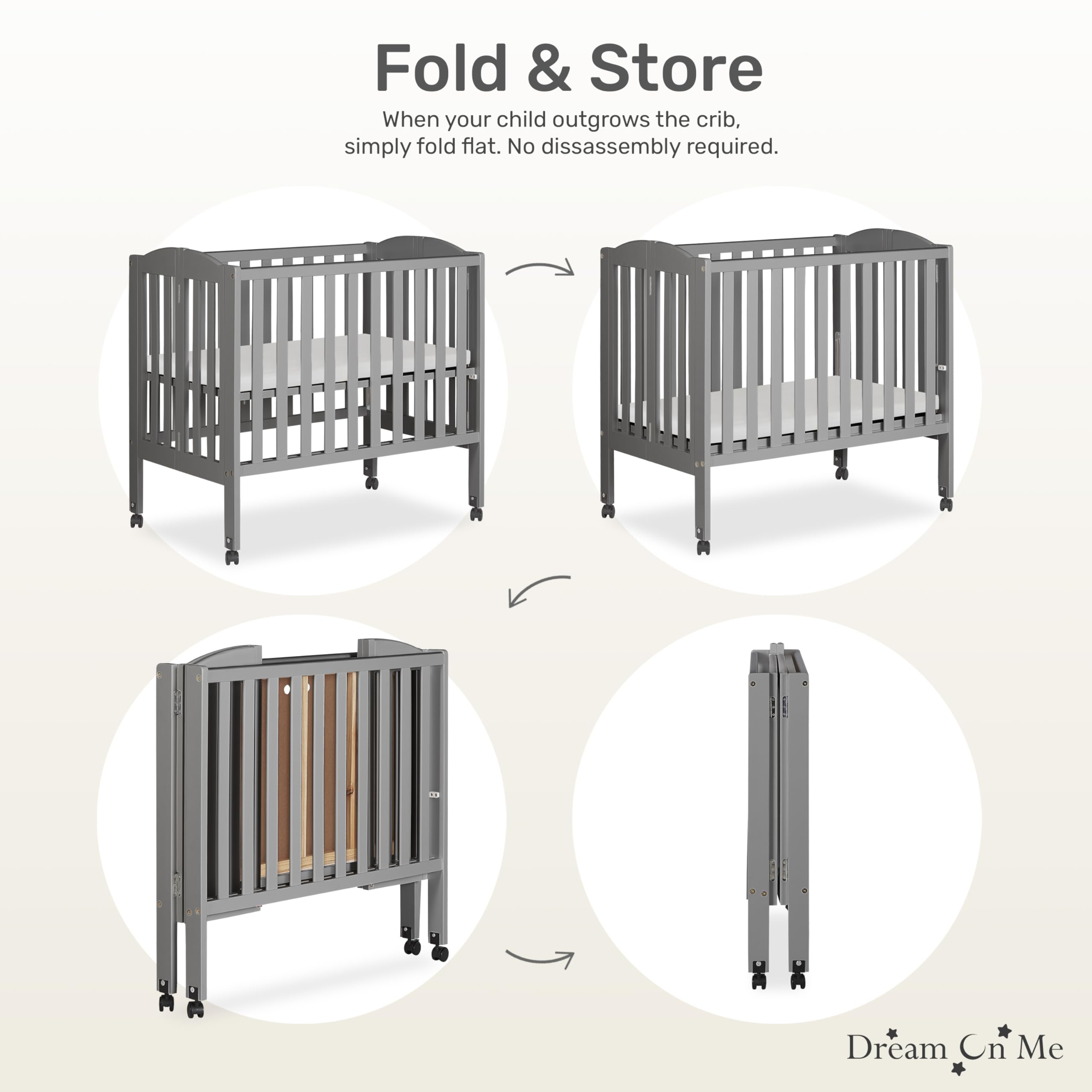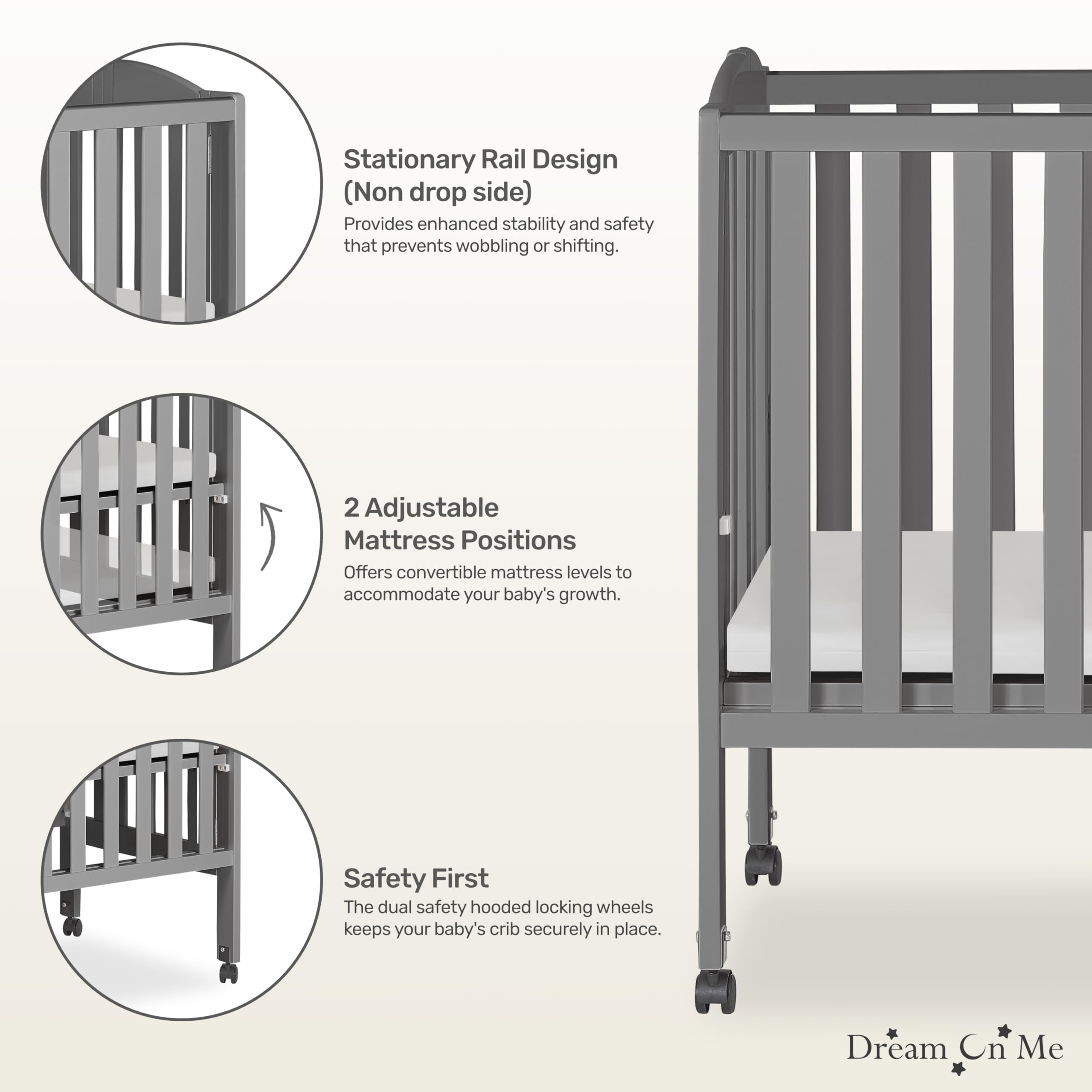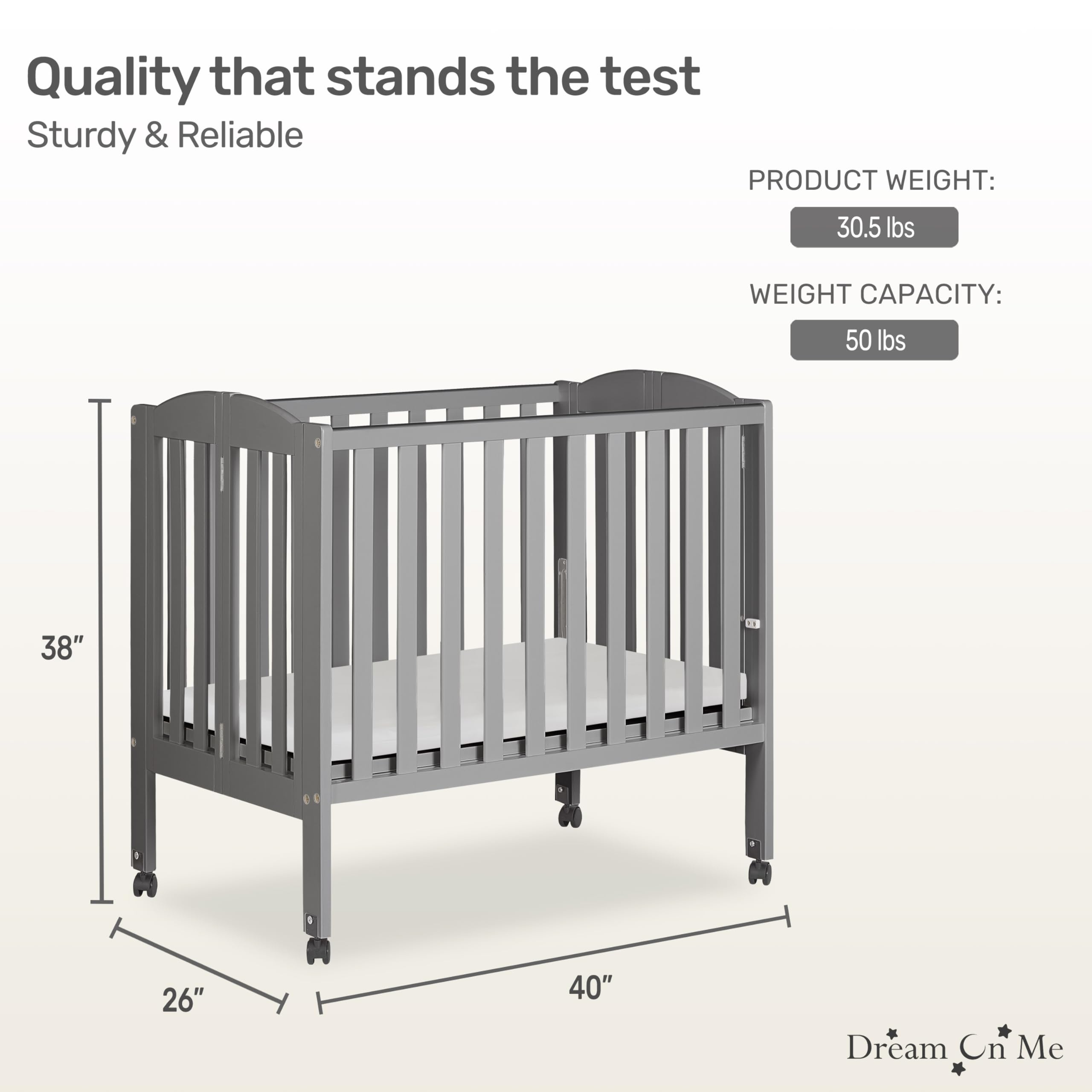 Sleek, compact, and thoughtfully designed, the Dream On Me 2-in-1 Portable Mini Crib brings modern style and practical convenience into any nursery or shared space. Its clean lines, smooth finish, and contemporary look ensure it blends seamlessly with a variety of décor styles, while its smaller footprint makes it the perfect choice for apartments, grandparents’ homes, or daycare centers. This versatile crib does more than just look good—it’s designed to adapt. The 2-in-1 functionality allows it to transition from a crib to a playpen, giving your little one a safe and reliable space to sleep or play. And when flexibility matters most, families can rely on our Patented Folding Mechanism (U.S. Patent #6817046 / #8479328 B2), which folds flat in seconds for stress-free storage and travel. Built from sustainable New Zealand pinewood, this mini crib combines natural strength with timeless appeal. It sits on **four smooth-rolling wheels—two locking and two non-locking—**so you can move it easily between rooms and lock it safely in place when needed. Parents can also feel confident knowing this crib is GREENGUARD Gold certified and meets ASTM and CPSC safety standards. It has been rigorously tested for over 10,000 chemical emissions and VOCs and finished with a non-toxic, lead- and phthalate-safe process—ensuring a healthy environment for your baby to sleep, play, and grow. Designed to grow with your child, the crib features two adjustable mattress height settings for newborn to infant stages. It also comes with a 1" compliant mattress pad, giving your little one a cozy and secure sleep space from the start. Measuring 40″ L × 26″ W × 38″ H, the crib offers comfort in a compact size, making it an ideal solution for smaller living spaces without sacrificing safety or convenience. The Dream On Me 2-in-1 Portable Mini Crib is where design meets practicality—beautifully styled, safety-certified, and crafted to give families portability, durability, and peace of mind.