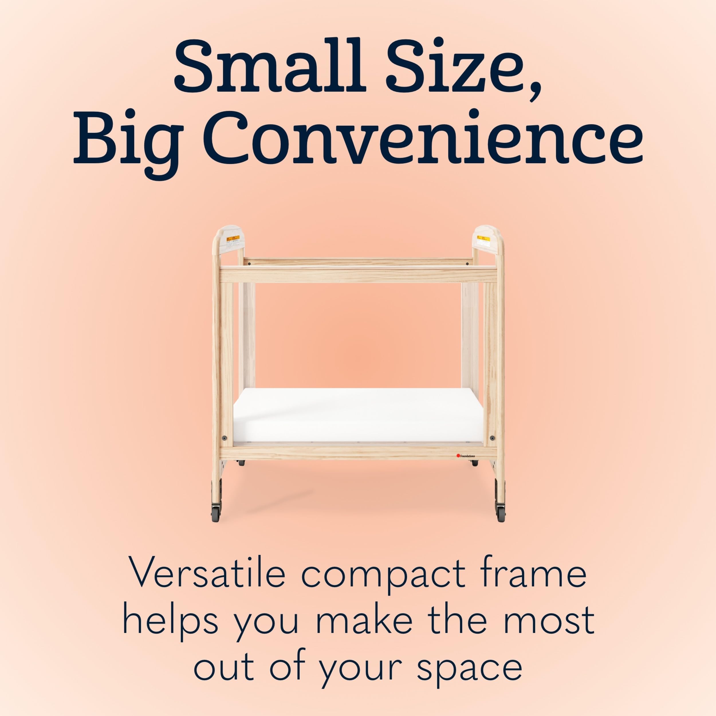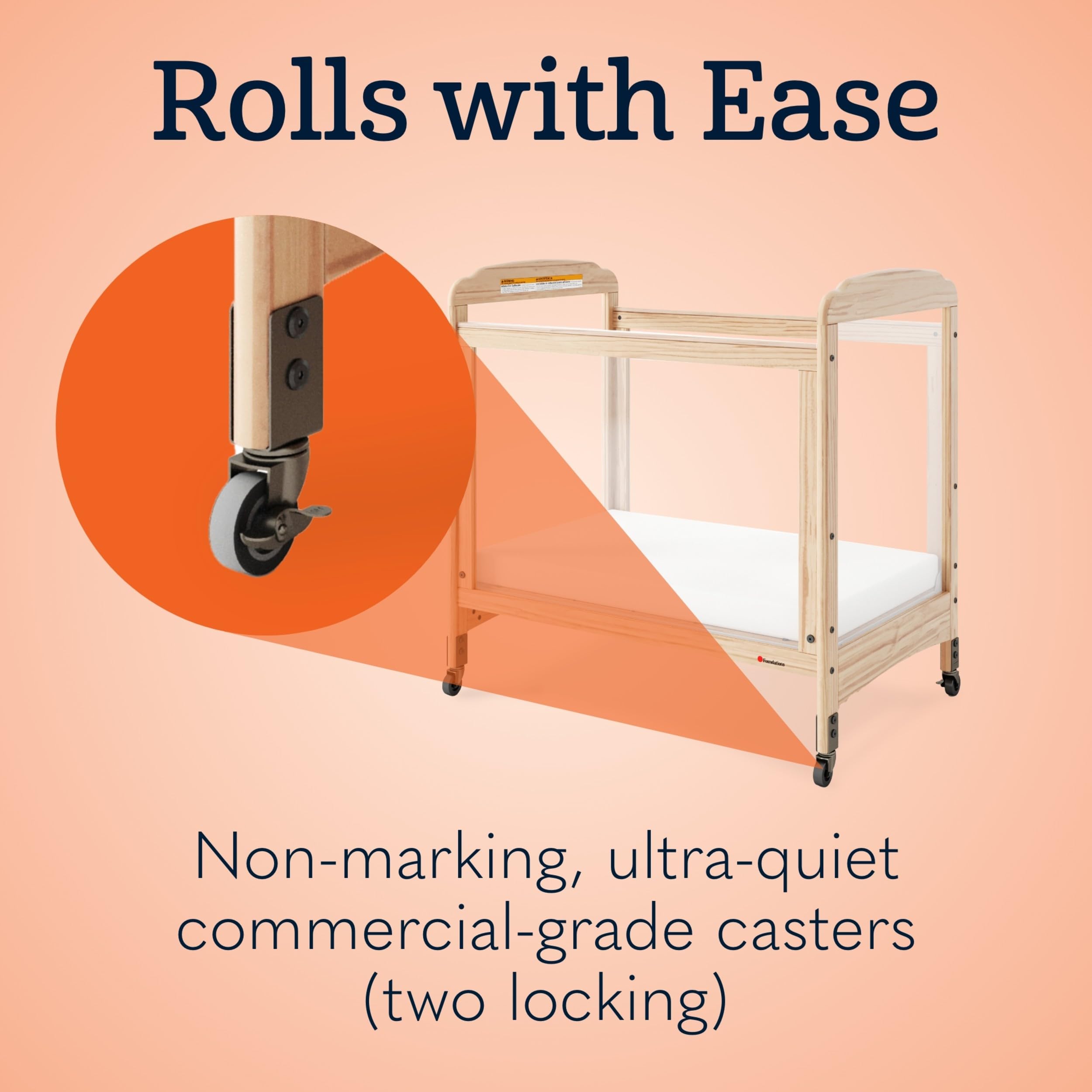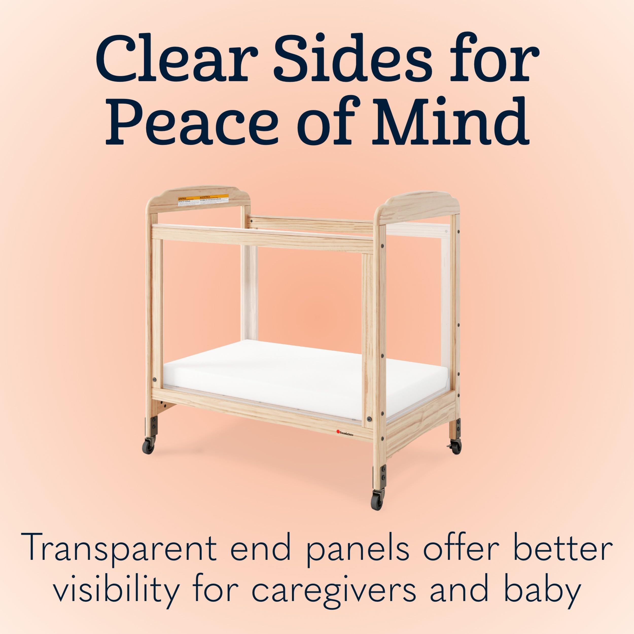 Foundations Serenity Compact 4 Side Clearview Daycare Crib, Fixed Side, Durable Wood Construction, Non-Marking Casters (2 Locking), Includes 3” InfaPure Foam Mattress (Natural)