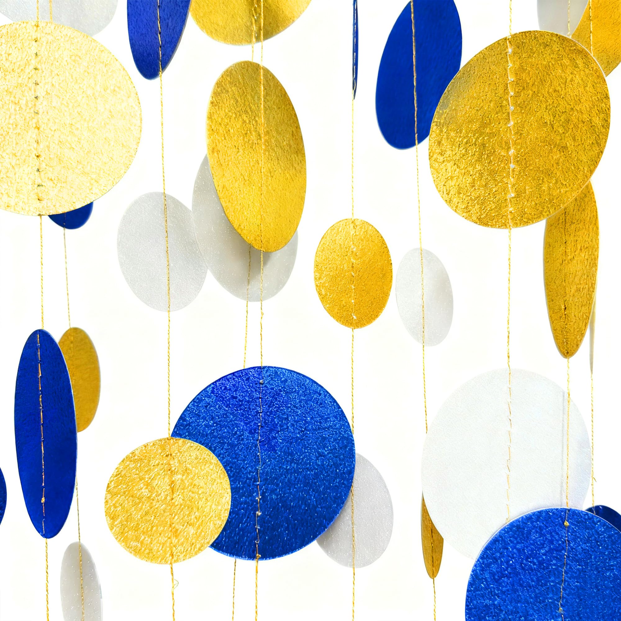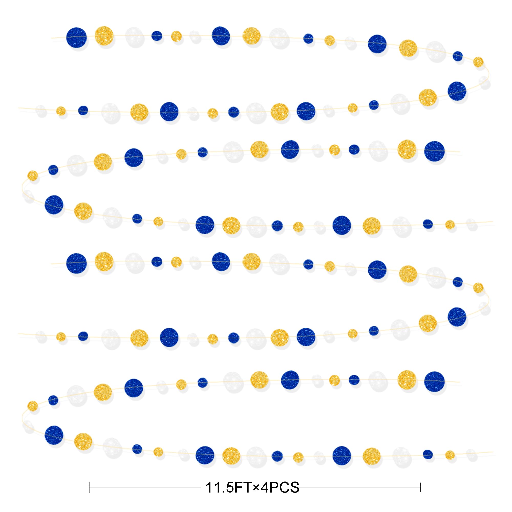 Package Contains - 4 set of royal blue gold white circle dot party garland streamer, Each string is 11.5 feet/3.5 meters, Total is 14 meters/46 feet.