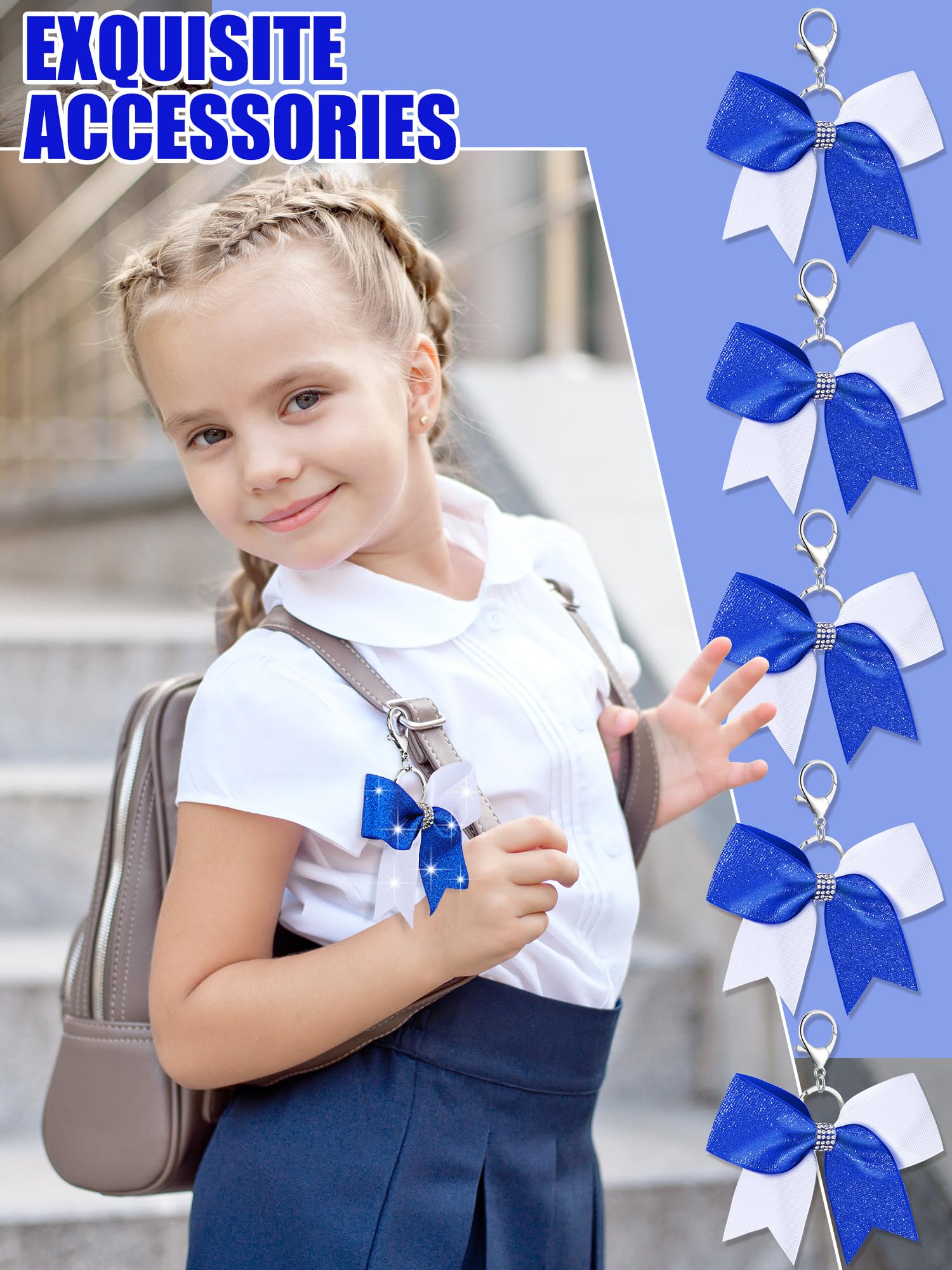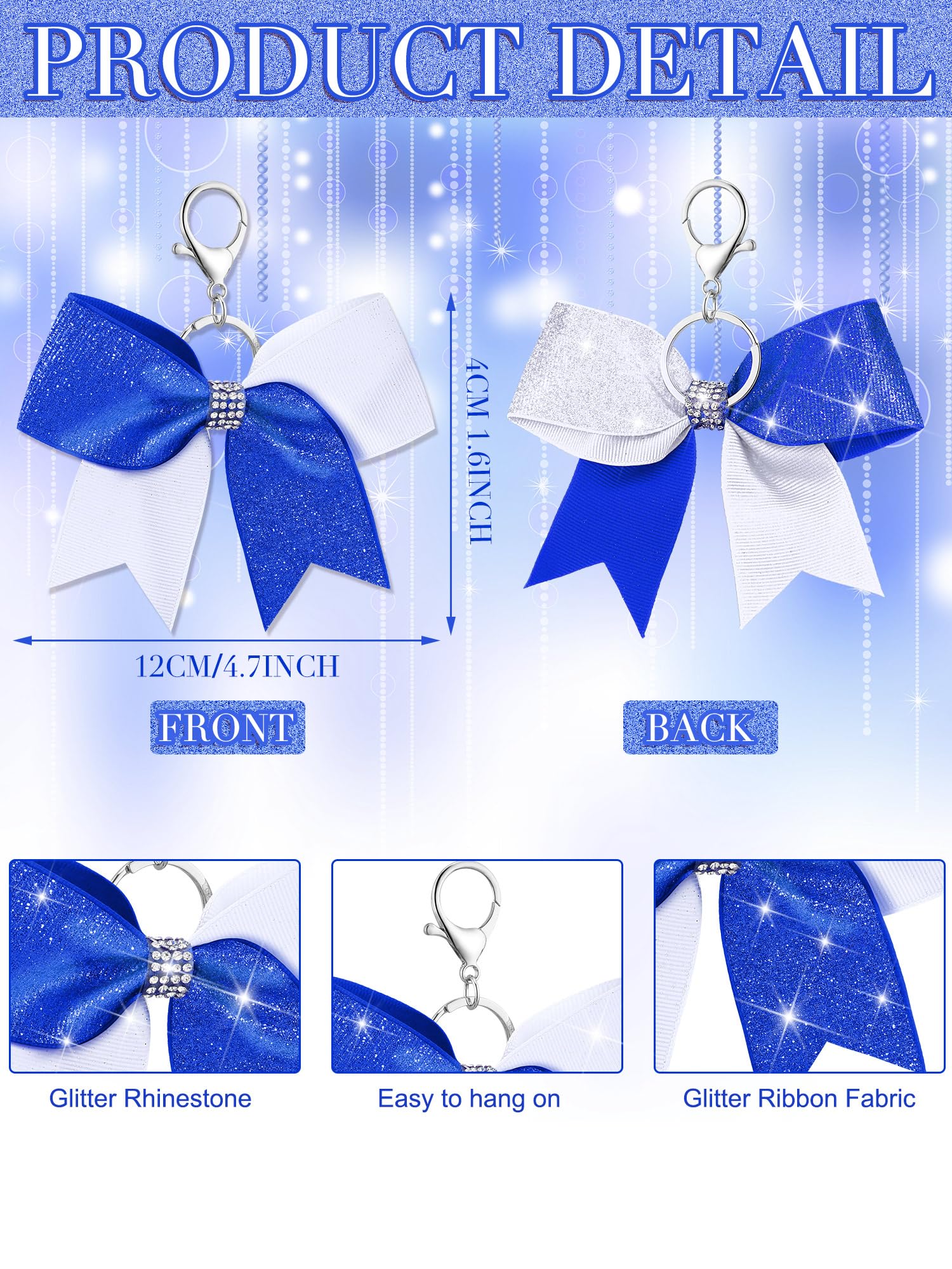 Proper Size: our blue and white glitter cheer bow keychains about 1.6 inches/ 4 cm wide, about 4.9 inches/ 12 cm long, in the classic bow shape, proper size for you to hang on your items, and the rhinestone and glitter effect will add a touch of elegant to your keychains