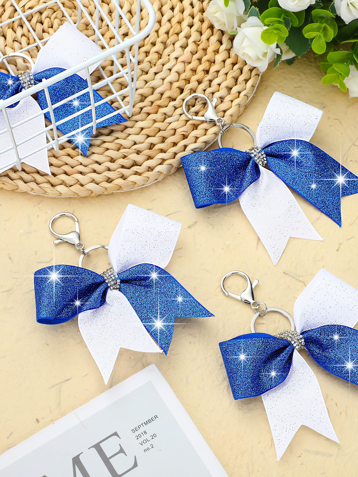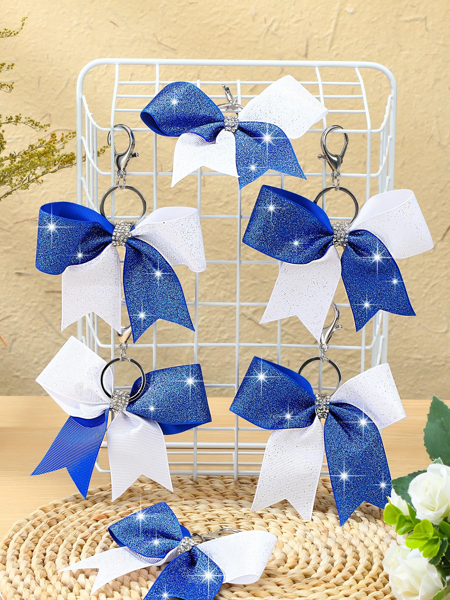 Quality Material: our blue and white glitter bow key chains are made out of fabric, sturdy metal, and rhinestones; This trio of materials makes a product that's not only visually appealing but is also designed to withstand daily usage; You can expect longevity and continuity of the aesthetic appeal