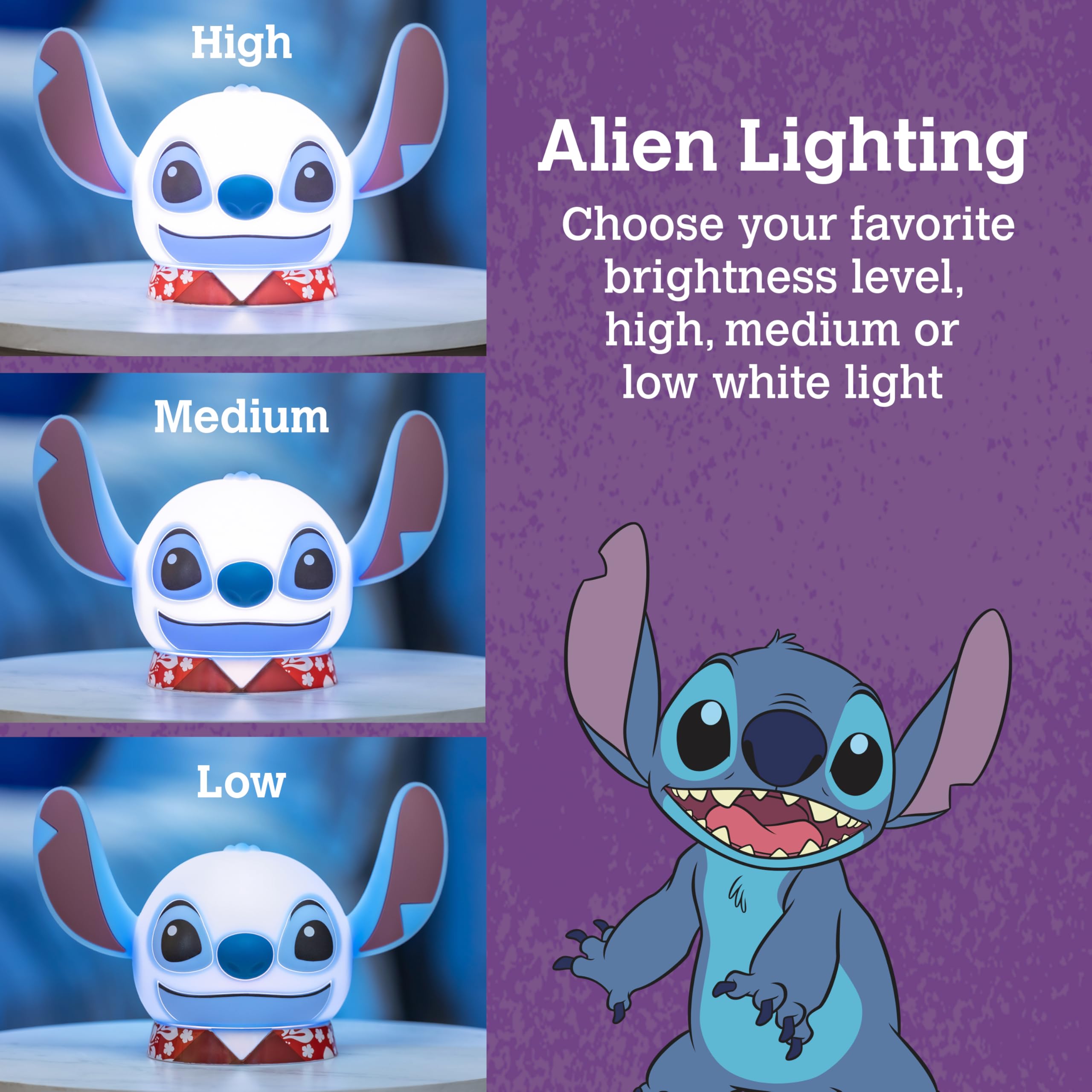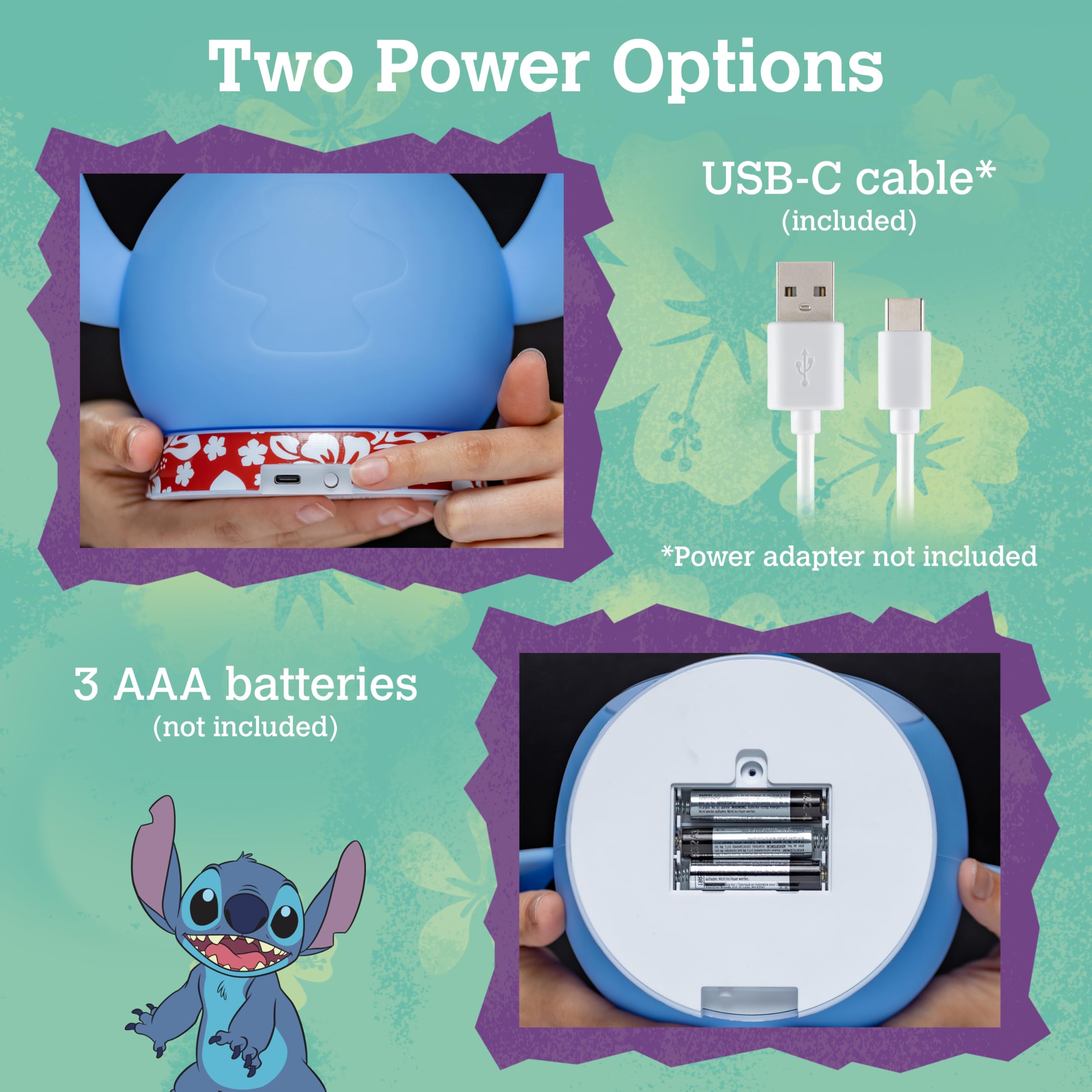 Enjoy an alien aloha with the Stitch Squishβems Light! Featuring the lovable design of Stitch himself, this soft, squeezable light is perfect for any fan of the Lilo and Stitch movie or the magic of Disney. Great as a night light in bedrooms, a fun accent light, a desk light or tabletop lamp, fill any space with fun illumination. Simply press the ON/OFF button to turn the light on, then gently tap the underside of the base to switch between three levels of white light. Press and hold the ON/OFF button to turn the light off. There are two ways to power the squishy light β the included USB-C cable or three AAA batteries (not included). Using the USB-C cable (5V, 1A USB-A adapter required) provides a streamlined, energy-efficient way to keep your space lit. Using batteries lets you take Stitch with you on the go! Created to last, cool to the touch and certified for safety, this light is designed for your peace of mind. Light your space with the goofy extra-terrestrial charm of Disneyβs Stitch Squishβems Light.
