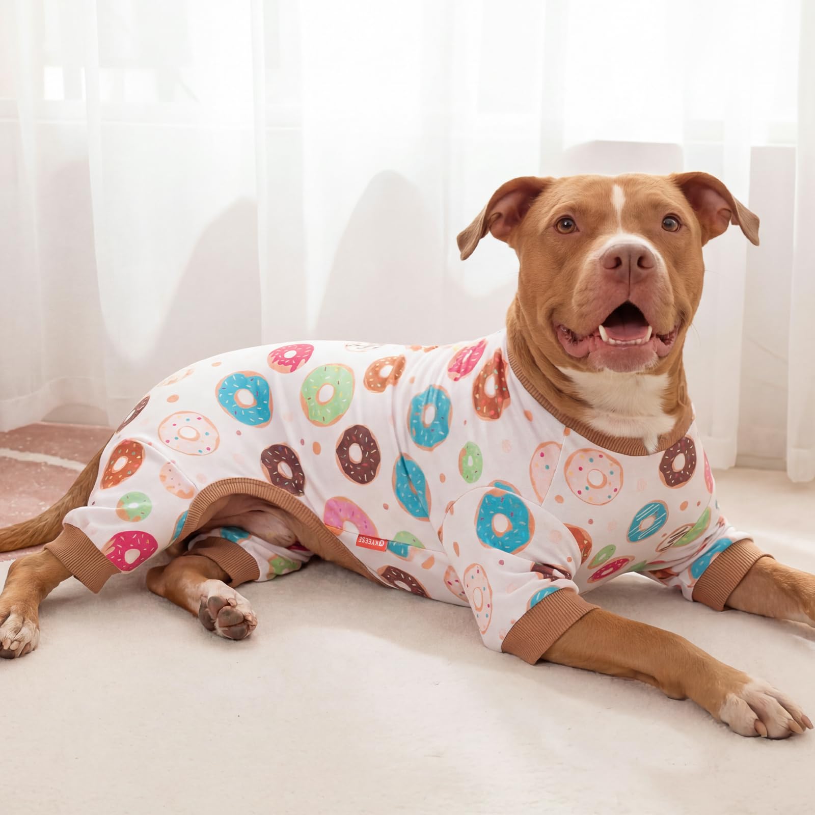 KYEESE dog pajamas are designed to provide comfort and fashion for small mediium and large dogs. Made from soft, breathable fabric, this 4-leg jumpsuit provides a gentle skin feel and retains body warmth for year-round indoor use. Featuring cute pattern and high-cut belly for easy potty breaks, its stretchy design allows free movement for sleeping, lounging, or walking. It also acts as a protective layer to contain shedding hair and reduce dander on furniture. Machine-washable with reinforced seams for durability, available in multiple sizes for a snug, flexible fit on various body types.