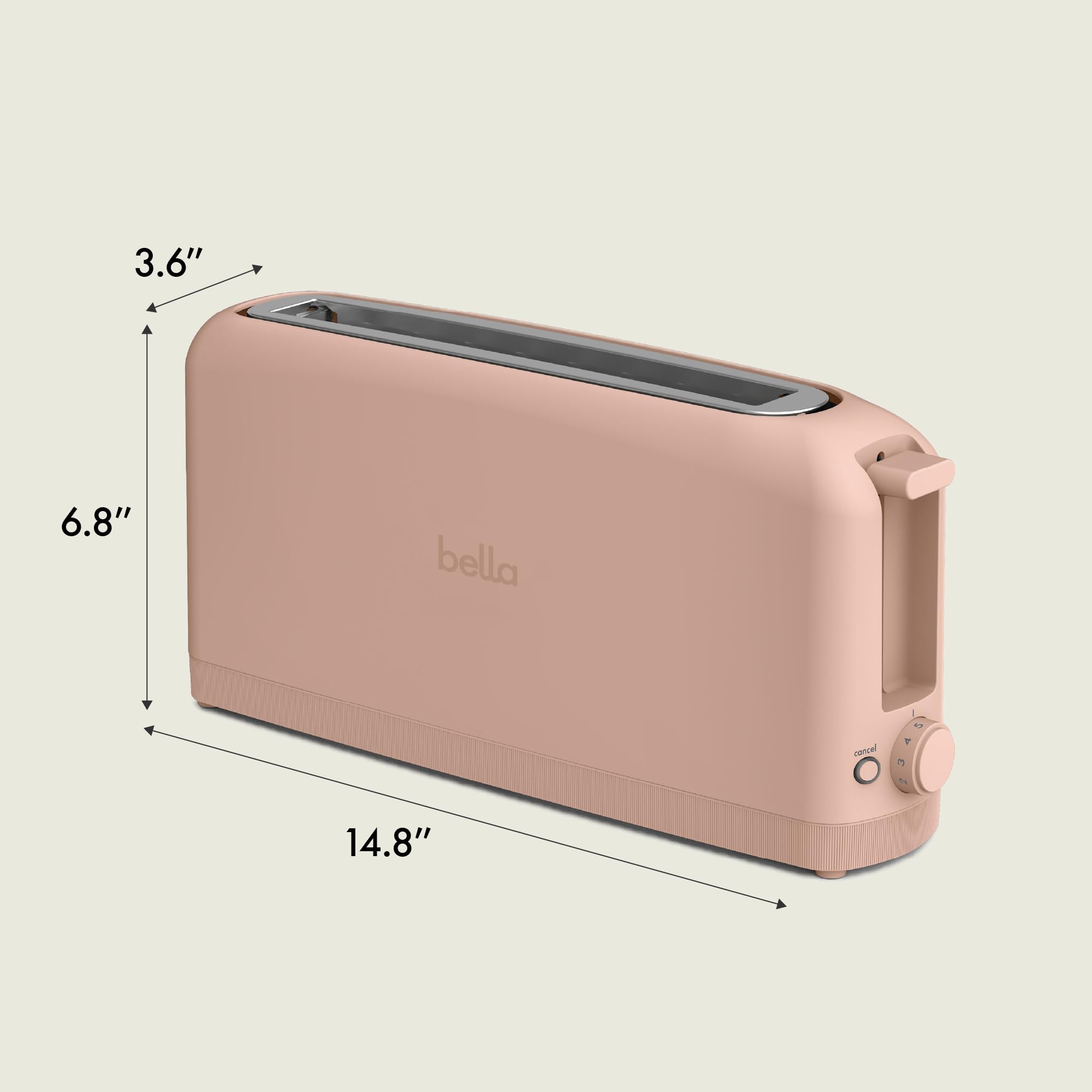 Introducing the bella 2-Slice Slim Toaster, where innovative design meets ultimate functionality. With a unique 10-inch long slot, this bagel toaster effortlessly accommodates two slices of square bread side by side or a variety of artisanal breads, sourdough, bagels, baguettes, and thick Texas-style toast. The wide toasting space and slim 3.58" profile make it a perfect fit for any kitchen, combining versatility with space-saving efficiency. Control your toast exactly the way you like it with the 6-setting shade selector, plus Reheat and Cancel functions for precise browning. The high lift lever ensures easy access to smaller items like English muffins, while the auto-centering guides keep everything perfectly aligned for even toasting every time. Cleaning this toastie maker is a breeze with the removable slide-out crumb tray, and the anti-jam and auto shut off features provide added safety and peace of mind. Powered by a 900-watt toasting system, this toaster delivers quick and consistent results. Available in five stylish bella colors—Oatmilk, Surf, Plum, Seaglass, and Blossom—the long slot toaster is a modern, practical addition to any kitchen, offering both functionality and aesthetic appeal.