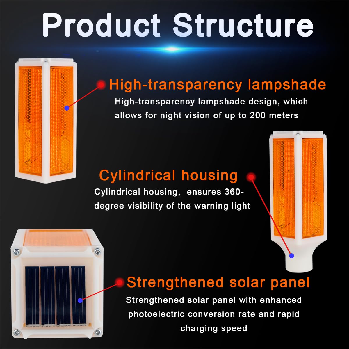 [Design]: The warning light's visibility is enhanced thanks to the high-transparency lampshade design, which allows for night vision of up to 200 meters. The warning light's 360-degree visibility is ensured by its cylindrical housing.