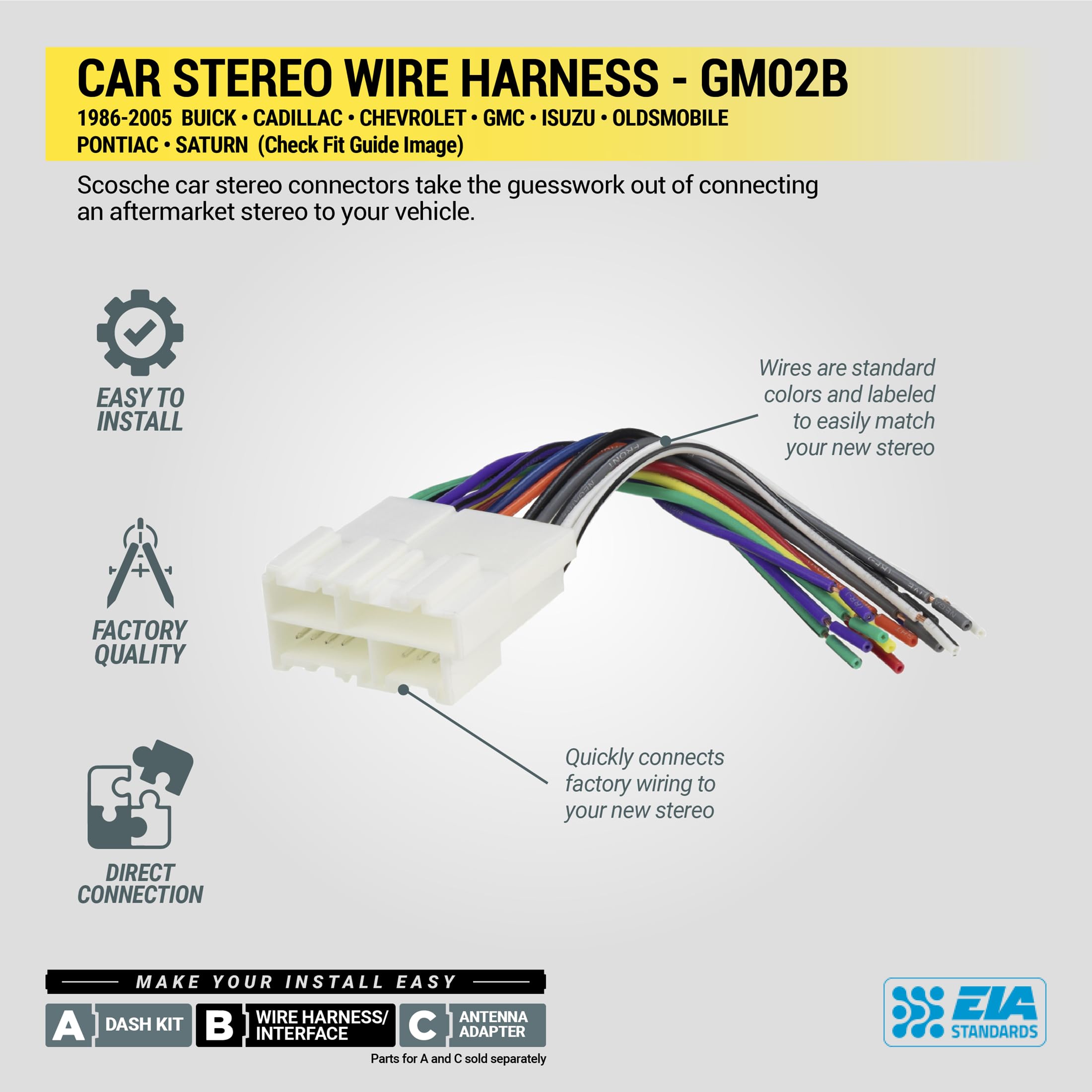 Convenient Solution - Scosche GM02B Radio Installation Harness allows a new aftermarket radio to be installed in Select 1986-2005 Buick, Cadillac, Chevrolet, GMC, Isuzu, Oldsmobile, Pontiac and Saturn Vehicles vehicles using the factory radio harness