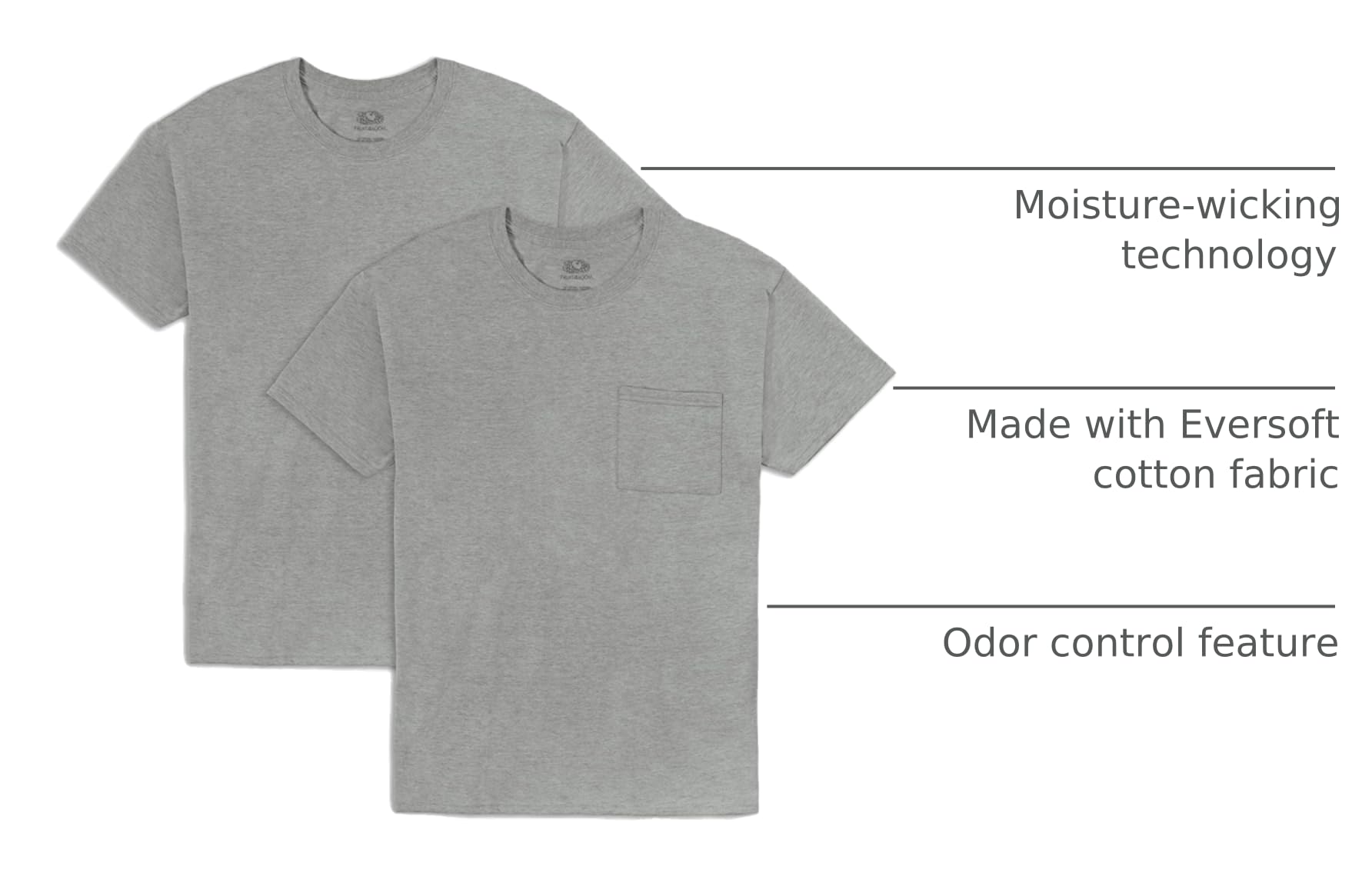Description Our Men's Pocket T-shirts are a casual wardrobe staple that you are going to love to live in. Featuring a collar, super soft cotton and reinforced pocket, the Fruit of the Loomยฎ men's Pocket T-shirts are designed for comfort and made to last. Each shirt has long lasting construction and quality that you can expect from Fruit of the Loomยฎ. Live your life more comfortably with Fruit of the Loomยฎ men's Pocket T-shirt. These are designed to wick moisture away, so you can stay cool and dry.