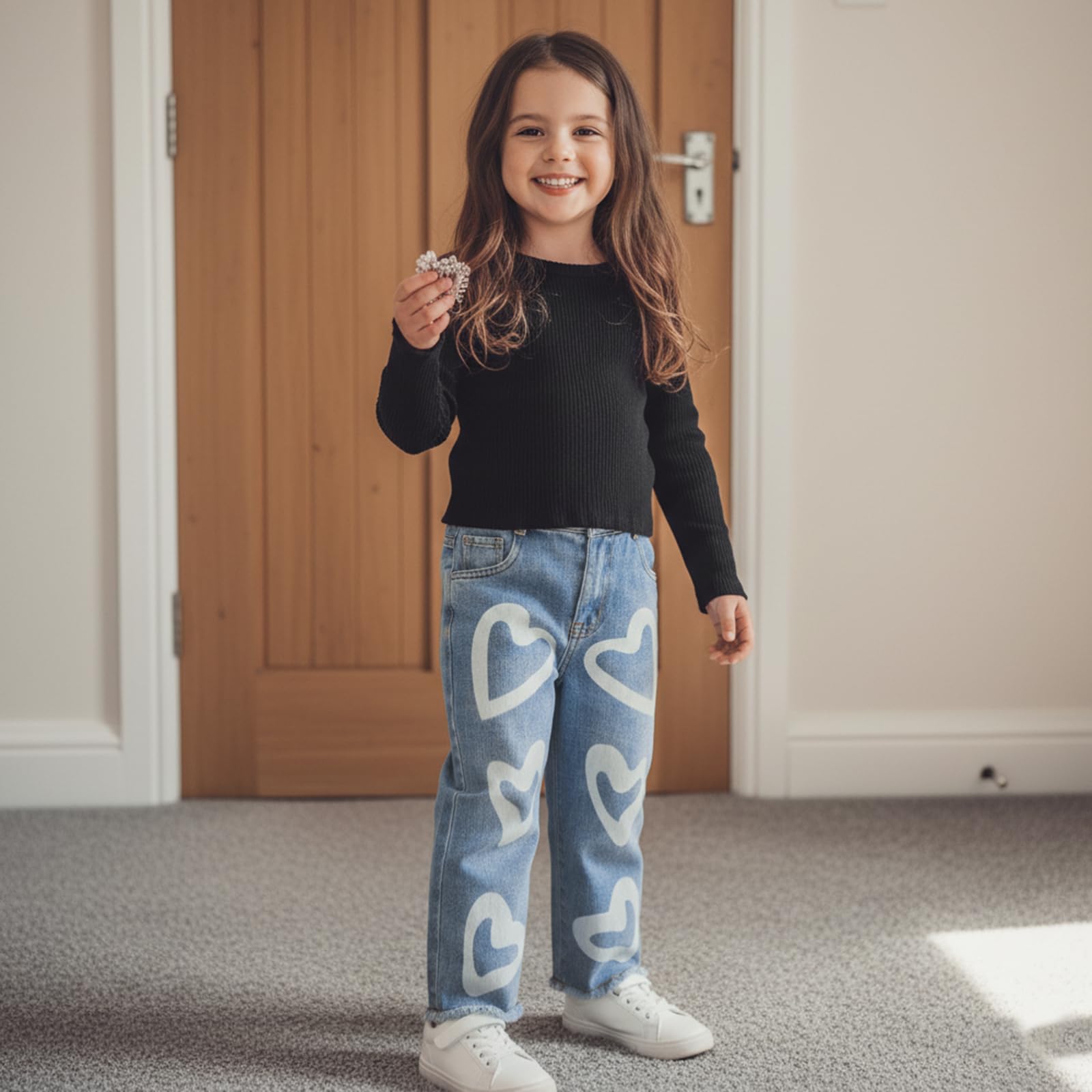 DESIGN: Toddler valentine's day outfits for girls, girls tops use solid color, ribbed, crew neck, long design, matches heart print jeans, chic and stylish.Our cotton blend soft baby girl sweatshirts and pants are crafted to be extra soft and comfy,built to last season after season