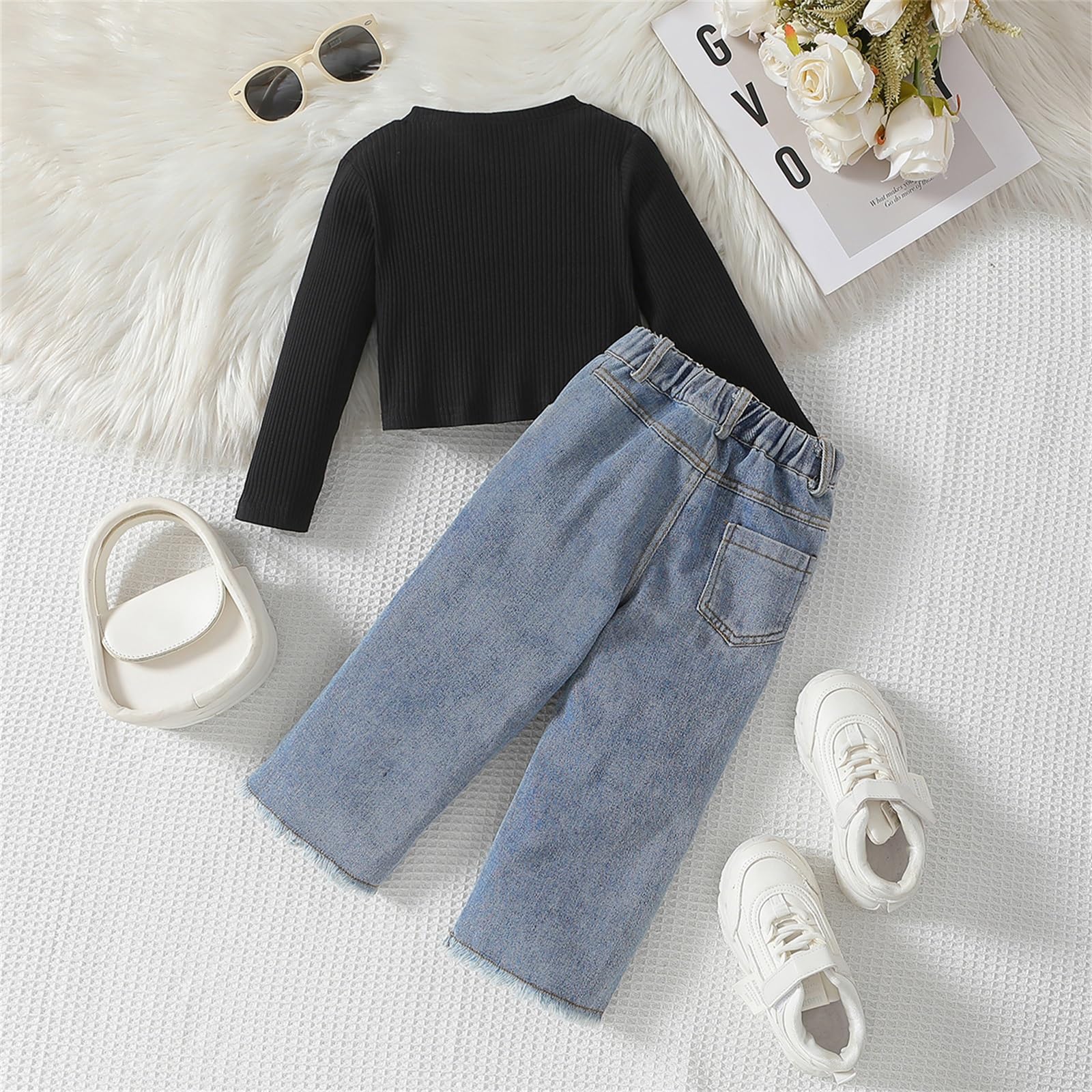 PACKAGE INCLUDED: 1x tops + 1x jeans. Cotton blend for baby girl outfit,cute for girl to dress in Spring fall, no harm to toddler girls skin health. Great gift for your little one.Wash gentle cycle cold with like colors/do not bleach and dry low/iron low when needed