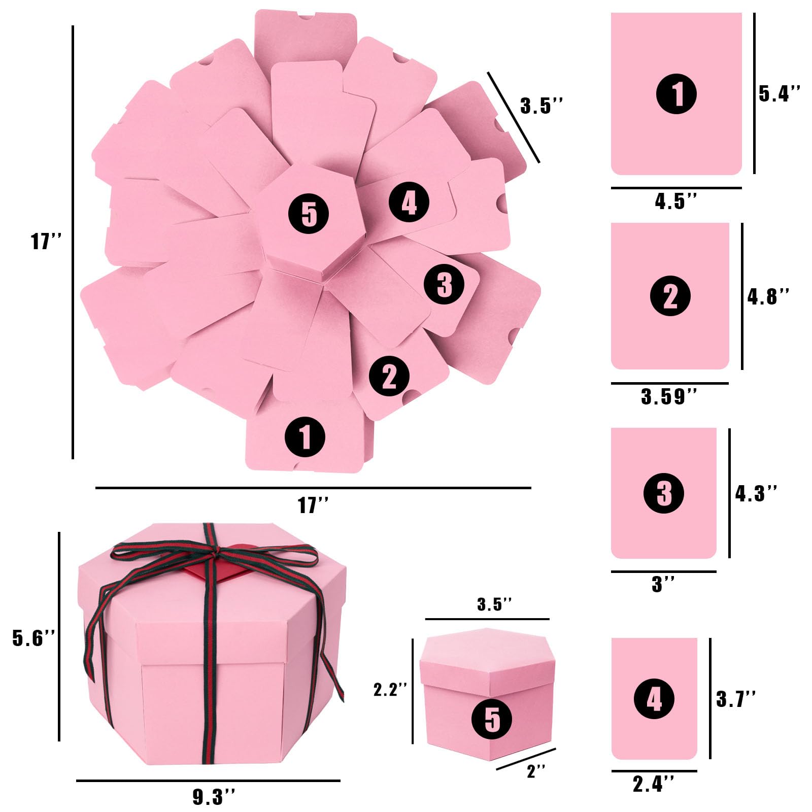 VARIOUS SIZES - The explosion gift box is 17 x 17inch when unfolded and 9.3 x 5.6inch when folded. The smallest gift box is 3.5 x 2.2inch. Sizes for photos in each layer: the innermost layer: 3.7 x 2.4inch, the second layer: 4.3 x 3inch, the third layer: 4.8 x 3.59inch, and the fourth layer: 5.4 x 4.5inch.