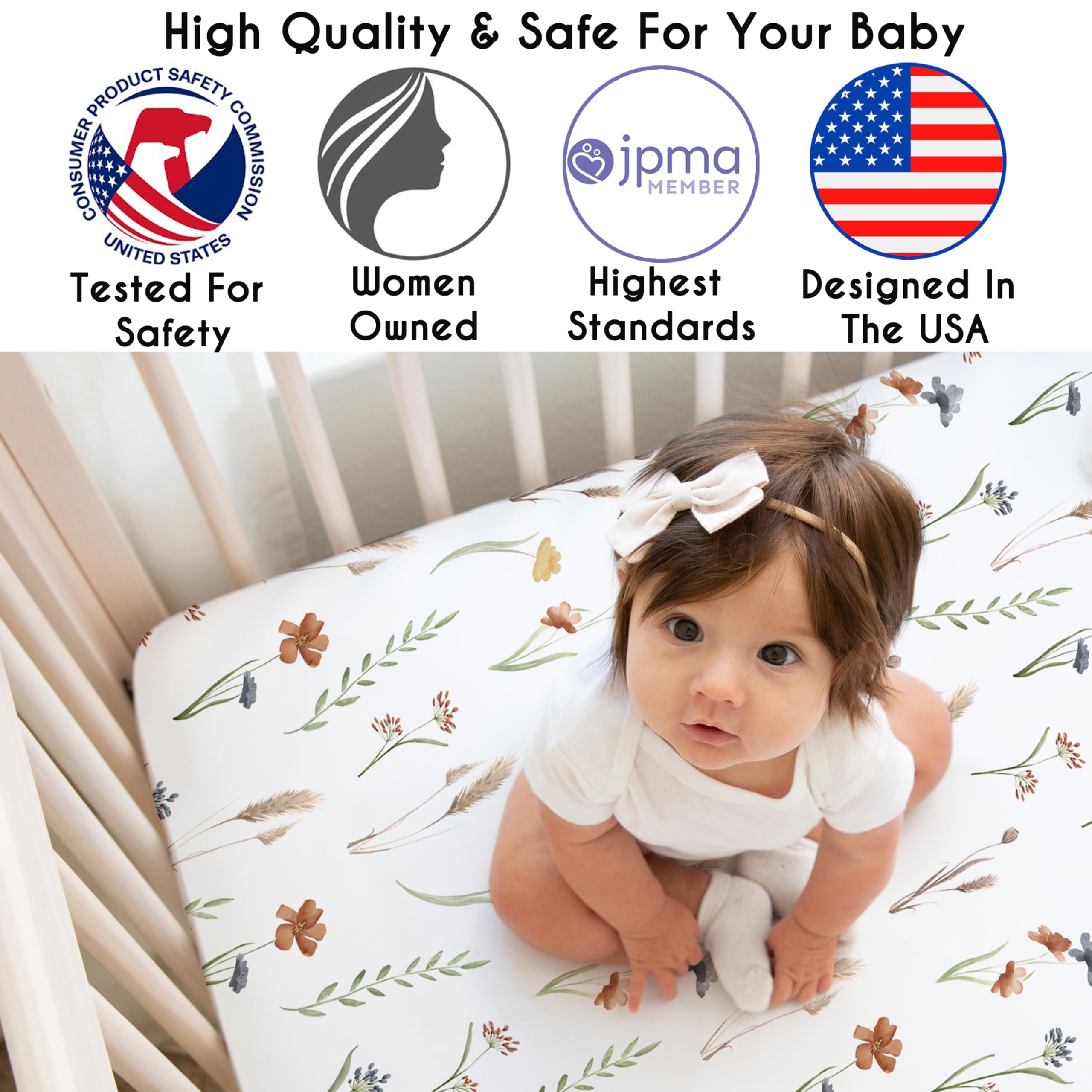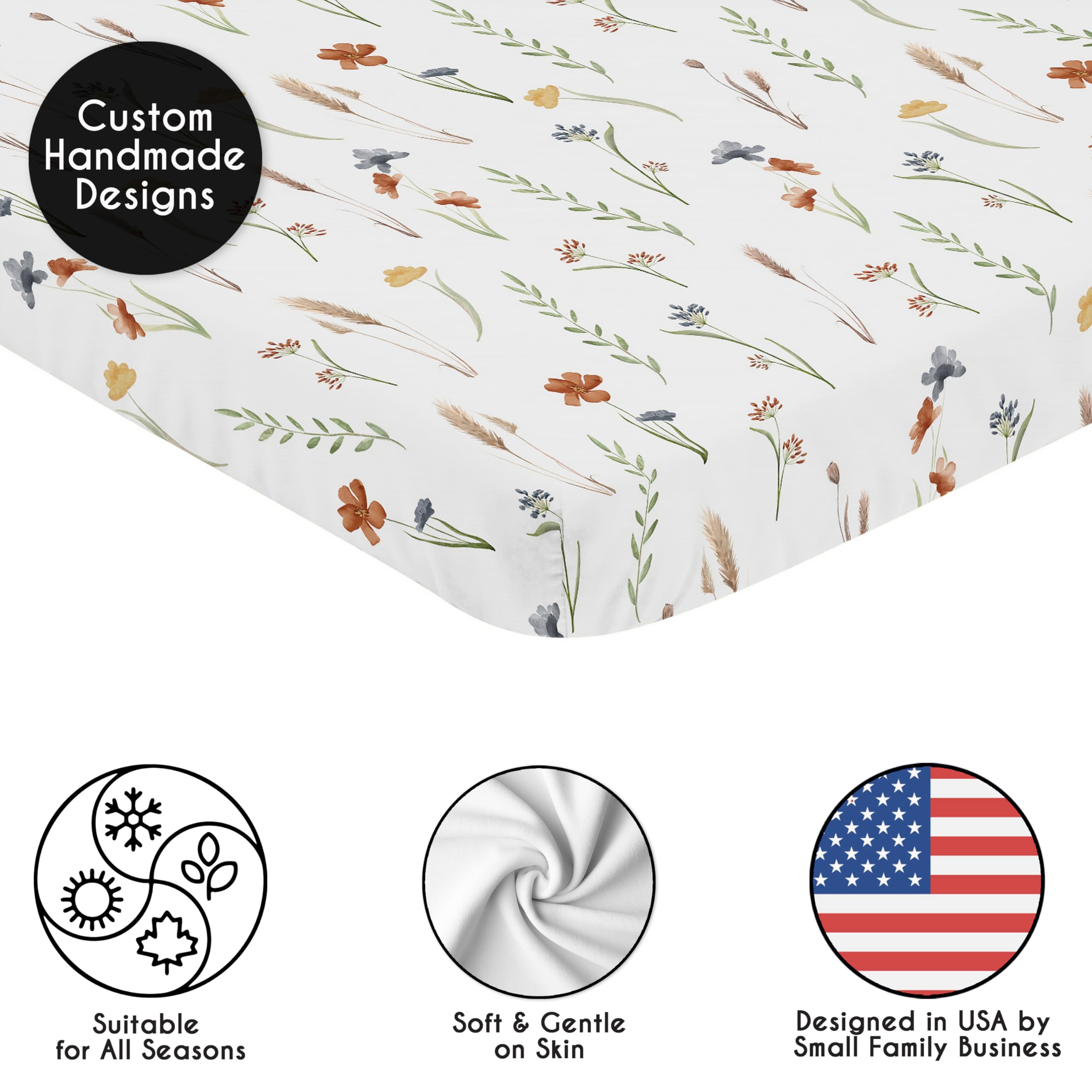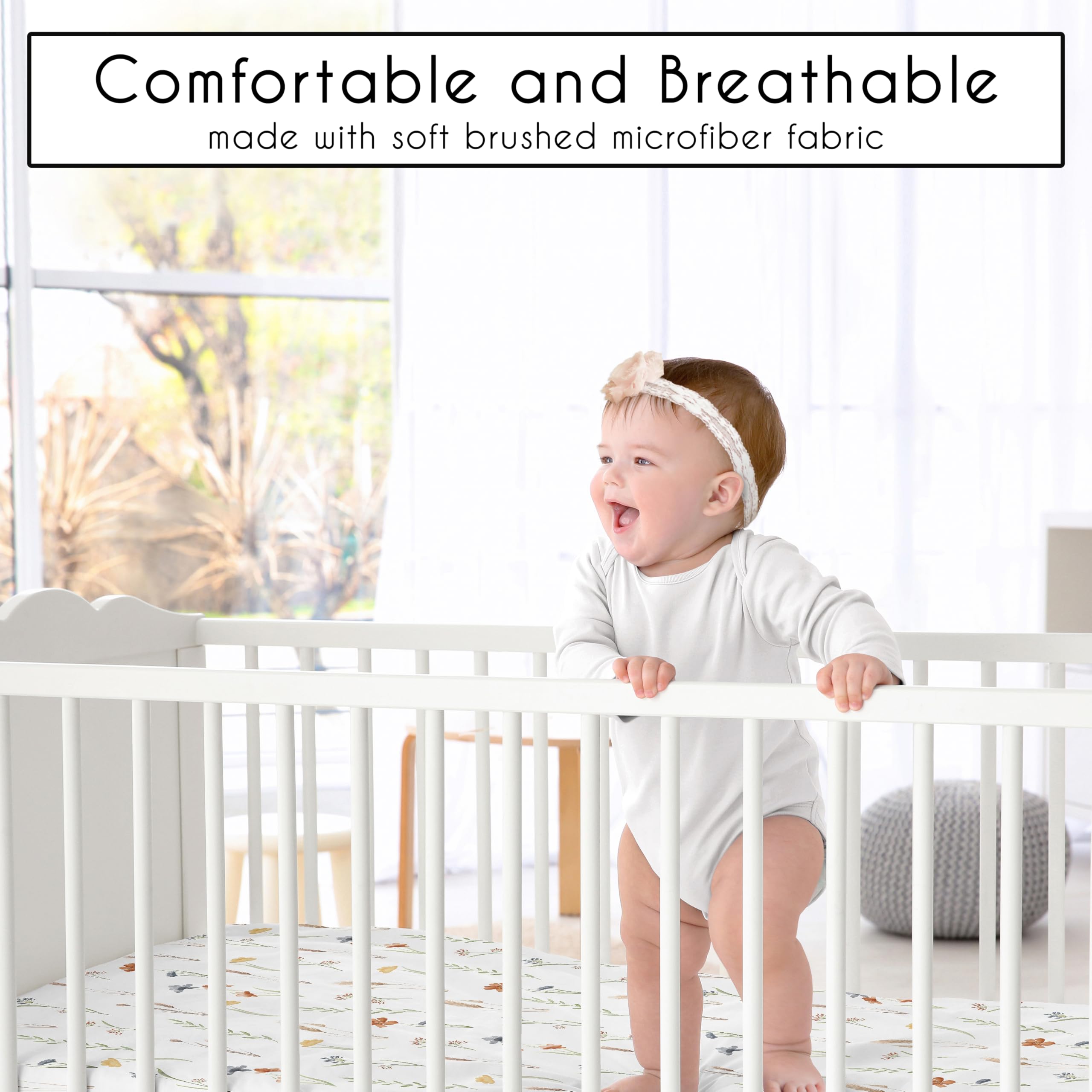 SNUG FIT: Includes (1) Mini Crib Mattress Sheet 24in. x 38in. x 5in. Our newborn mini crib sheets fit snugly, with premium elastic sewn around the entire bottom edge for a secure fit on most smaller size cribs, play yards, & portable cribs to reduce shifting & bunching. This brushed microfiber pack and play sheet features an exclusive design of a sage green, beige, blue & rust orange vintage, shabby chic wildflower garden print and is gentle on delicate skin. WILL NOT FIT STANDARD SIZE CRIBS.