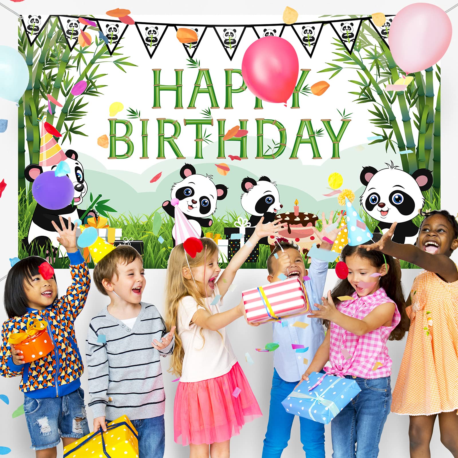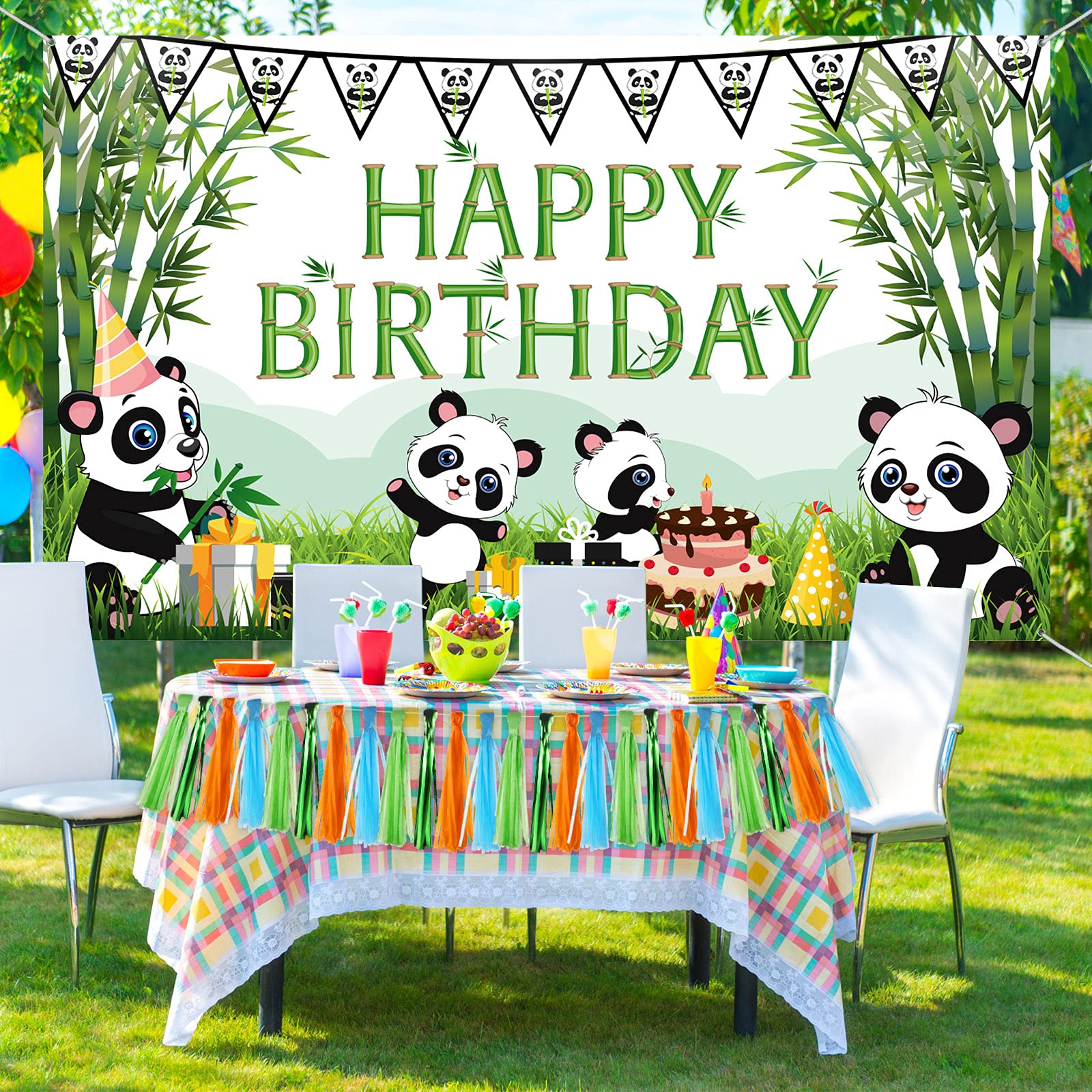 Cartoon Panda Happy Birthday Backdrop Green Bamboo Panda Theme Baby Shower Photo Background Kids Children Newborn Birthday Party Decorations Cake Table Decorations Feature: Vibrantly colored printing, seamless, durable, lightweight, easy to carry, durable and colorfast. Easy to assemble: Use a rope through the holes in the four corners of the background cloth, and hang it anywhere you want to decorate. Wide application: Suitable for many fun occasions, like baby shower party, kids birthday party, panda theme birthday party, wall decoration, indoor or outdoor activities. Specifications: Material: polyester fabrics Color: as shown in the pictures Size: Backdrop: about 5.9 x 3.6 ft/ 1.8 x 1.1 m String: about 20 ft/ 6 m Package includes: 1 x Cartoon panda birthday backdrop 1 x White string Warm notes: Please allow slight deviation in size due to manual measurement. Please allow slight color differences due to different monitors and light effects. Winding risk may exist, please keep away from children.