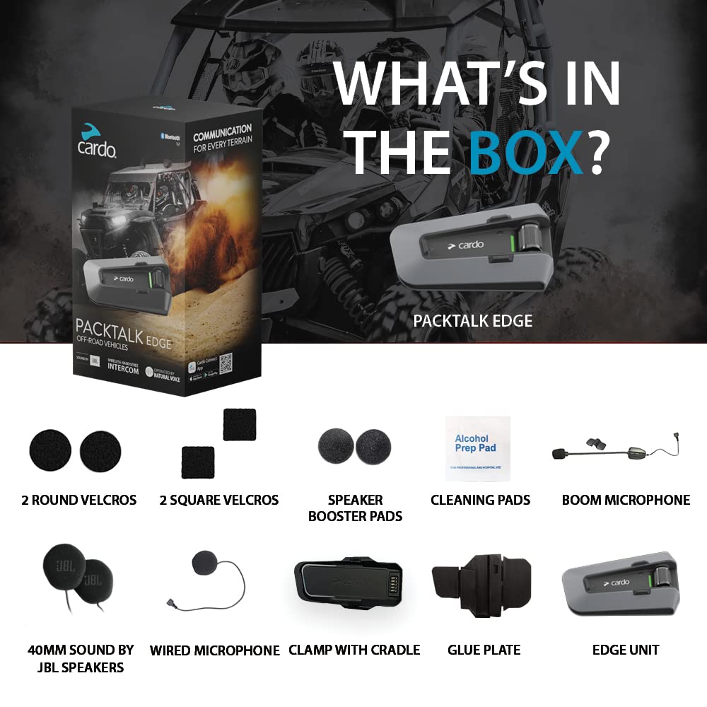 Wireless Handsfree Intercom: Communicate with just a single piece of equipment, small enough to fit on your helmet, without the physical restrictions of wired communication systems. Inside a vehicle, or between two vehicles with up to 1 mile range. Freedom to Roam: Enjoy the ease and convenience of not being bound to your vehicle – the freedom to move without restrictions, like being a spotter for your group. Connectivity follows you, not the other way around. Sand/Mud/Waterproof: All weather conditions and all terrain welcomed with your waterproof, dustproof, and mudproof unit. No-Cellular Coverage Needed: Broad, seamless coverage and reception. You’re “never” out of range, wherever you are. Sound by JBL: Powerful 40mm high-definition speakers engineered to perfection by JBL experts, with an improved music processor and three audio profiles. Natural Voice Operation: Keep your eyes on the trail and hands on the wheel for safer driving while using Natural Voice Operation. Just say “Hey Cardo” and tell it what you want, your PACKTALK EDGE ORV will do the rest. Rapid and Tool-Less Installation: Fast, easy and seamless installation. No bulky equipment, wiring harnesses, or remote antennas. FM Radio: Built-in FM Radio with RDS for automatic selection of the strongest signal – whether you are in town, or in the middle of nowhere. Over-The-Air Software Update: Update your unit directly from the Cardo Connect App. Automatic Volume: Automatically adjusts your sound volume based on the outside ambient noise. Music streaming: All the music you ever wanted streamed directly from your smartphone. Control, share and experience your favorite tune on the road. Phone and GPS: Make calls and control your GPS with a touch of a finger or the sound of your voice. 13 hours battery: 13 hours battery and Fast charging. Get 2 hours talk time battery after 20 minutes of charging. USB type C: Robust and universal USB type C for easy connections to any device. Control roller: Extra convenience and control, all in one small roller. Air Mount: Magnetic Mount. Simple and Secure. 3-Year Warranty: Extended 3-year warranty for your peace of mind.