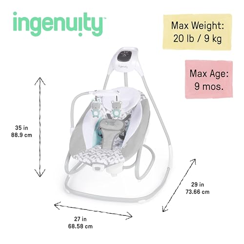The Ingenuity SimpleComfort Compact Soothing Swing & Rocker offers two new parent "must-haves" in one smart design. The plush baby swing converts into a rocker with a single easy motion. Designed in the USA for ultimate comfort, this swing from the #1 Manufacturer of Baby Entertainment* keeps baby close and secure. Choose between 6 speeds and 3 swinging directions to match babyβs preferences. The mobileβs 2 adorable plush characters entertain baby. The USB cord included powers the swing motion and music, while 1 C battery powers the vibration unit (AC adaptor and batteries not included). Use the included head support for newborns. The swing and rocker are lightweight and compact with wheels and a handle for portability. Easy care machine washable fabrics. You can rest easy knowing the vibration turns off in 30 minutes, and the swing has a 30-, 45-, or 60-minute timer and auto shut-off after 2 hours. Music shuts off after 20 minutes and includes parent volume control. To replace the battery, easily remove the cover at the base of the swing. Third party safety tested and approved. (*Circana, Retail Tracking Service, U.S., Entertainment products, dollar sales, Jan-Nov 2023 combined)