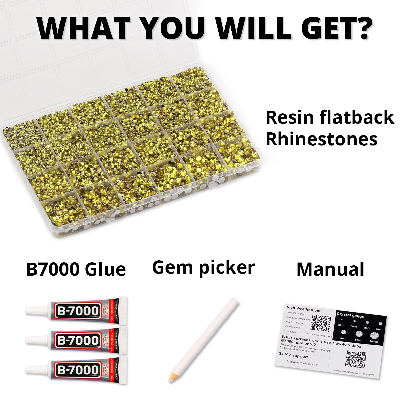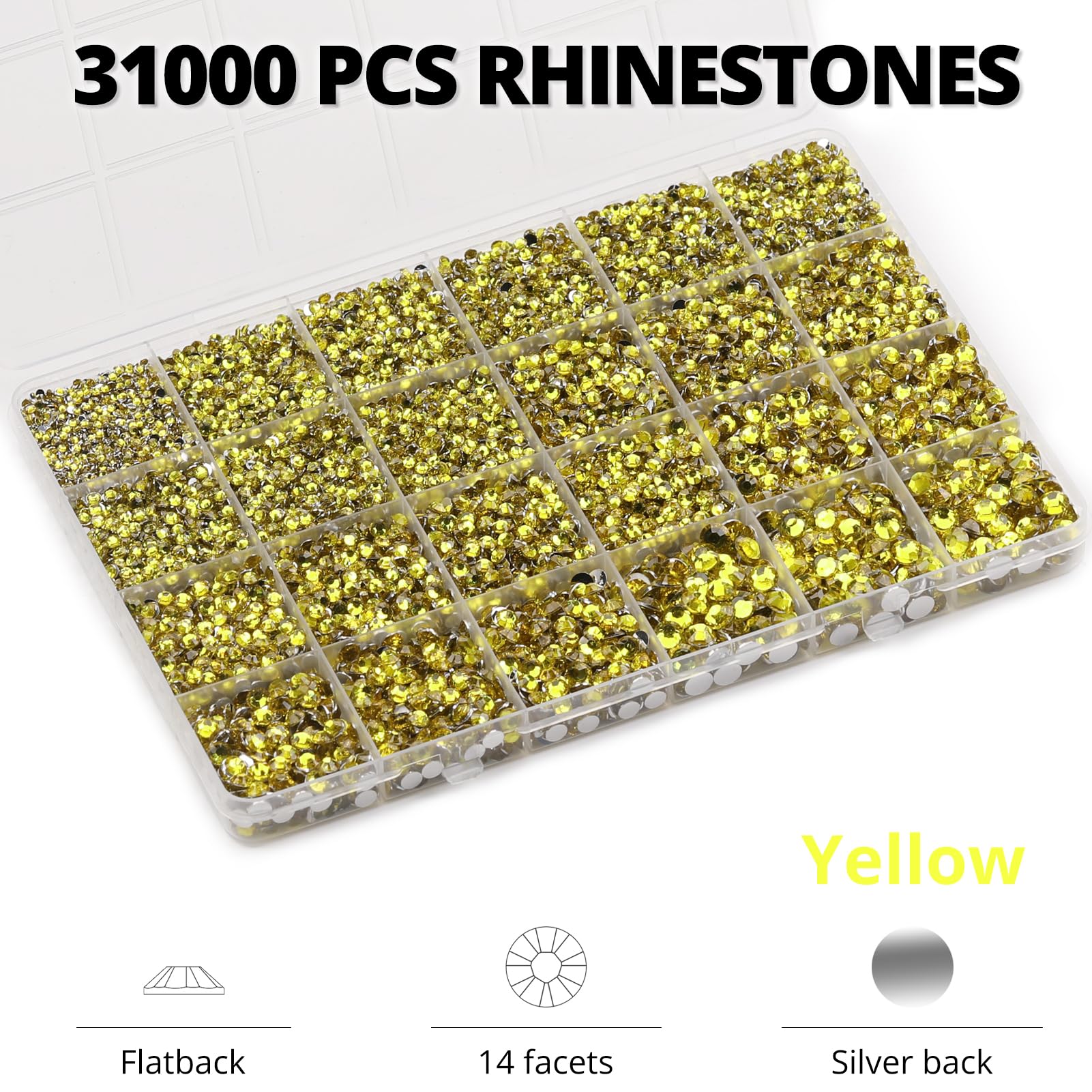 Package Content with Tool (pickup pen and manual) -- The bedazzler kit Package includes 1 yellow rinestones set with 24 grids, approx 31000 pcs of 2-6mm bling-out resin rhinestones