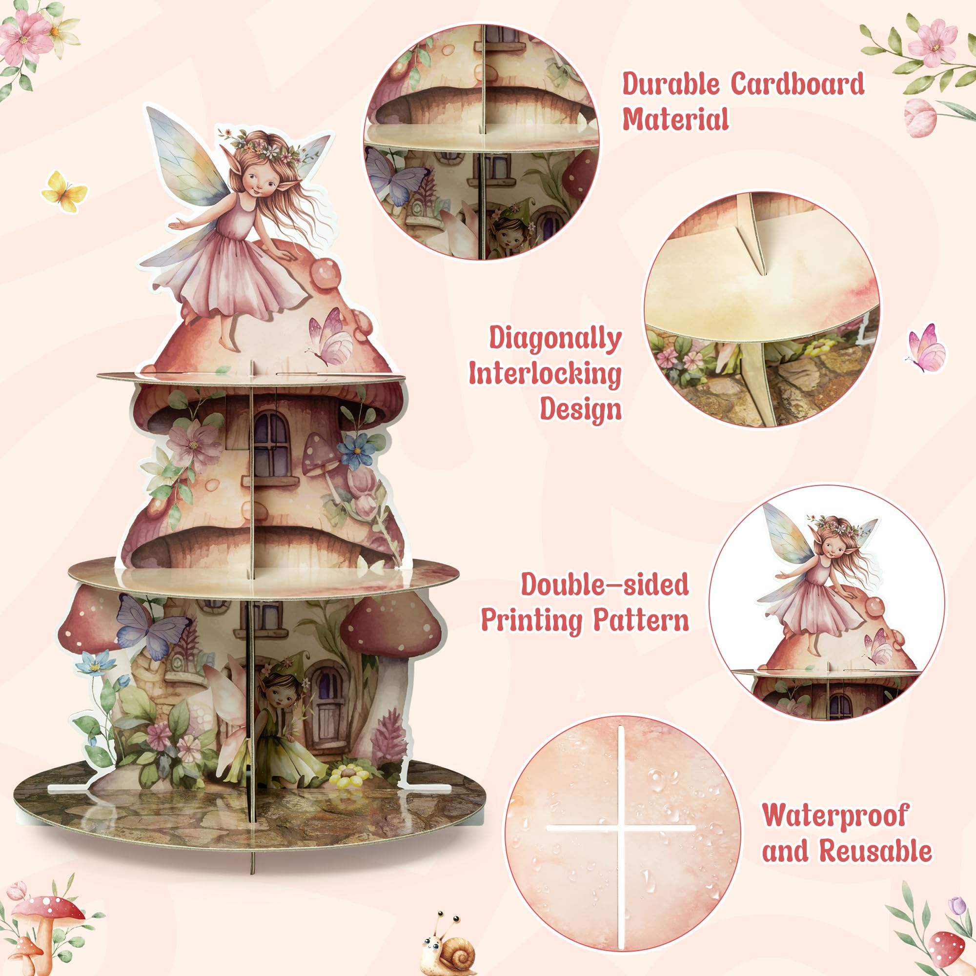 Cute Fairy Design: A paper cupcake tower with a fairy themed design. Each layer is meticulously decorated with adorable fairy, mushroom house live fairy girl, good reproducing the natural habitat of fairy. This cupcake tower not only has warm colors, but also a design full of childlike fun, making it nice for decorating at children's parties