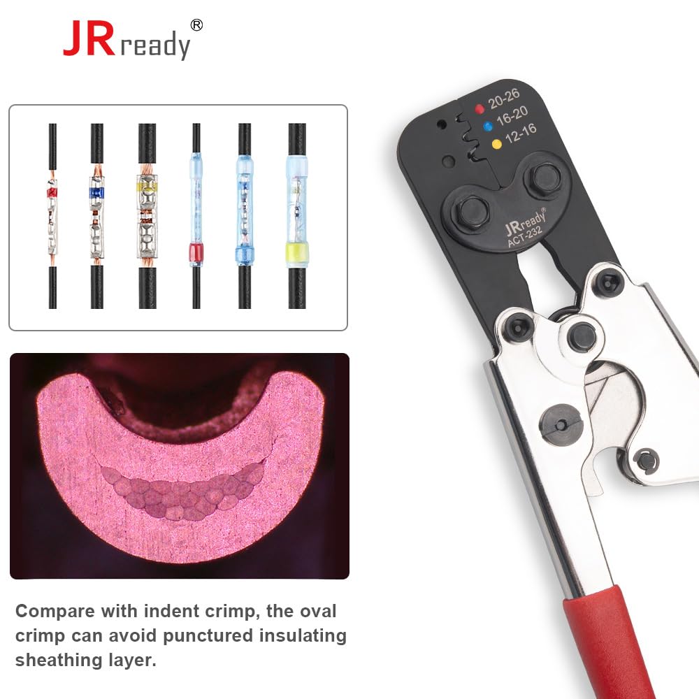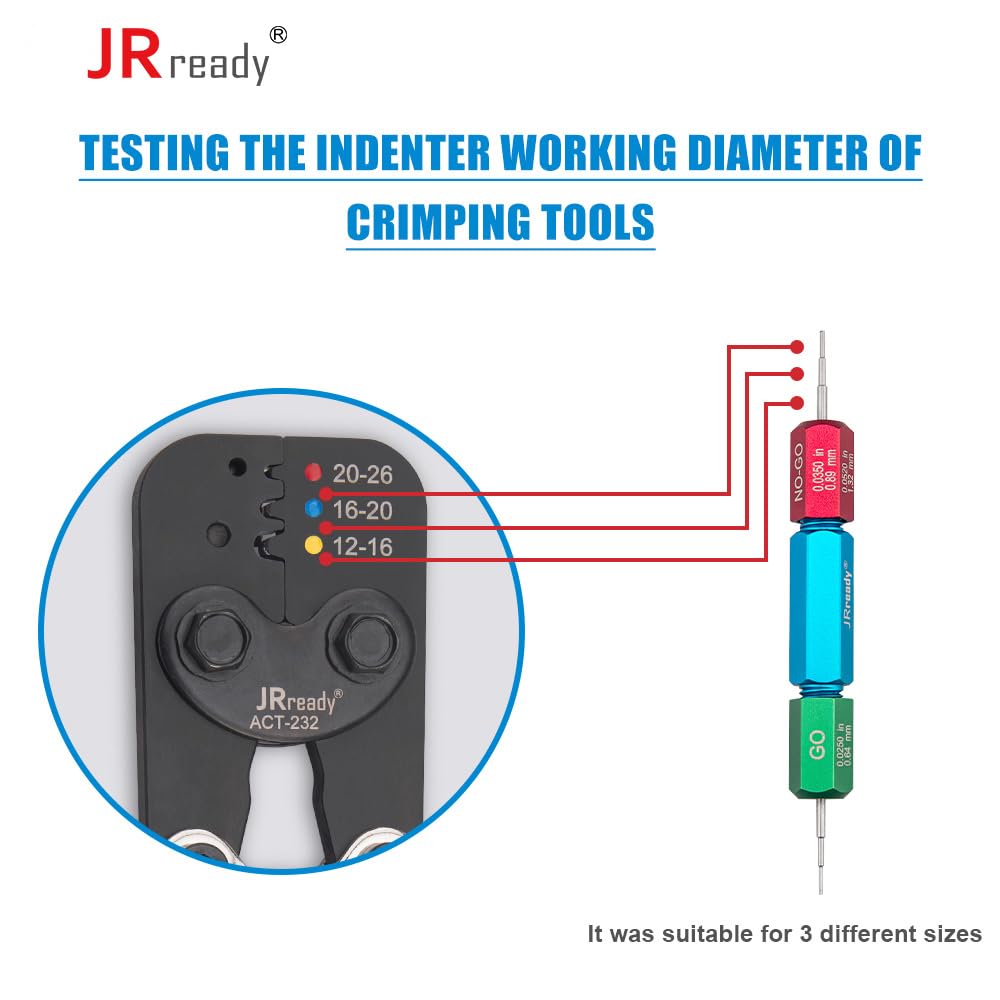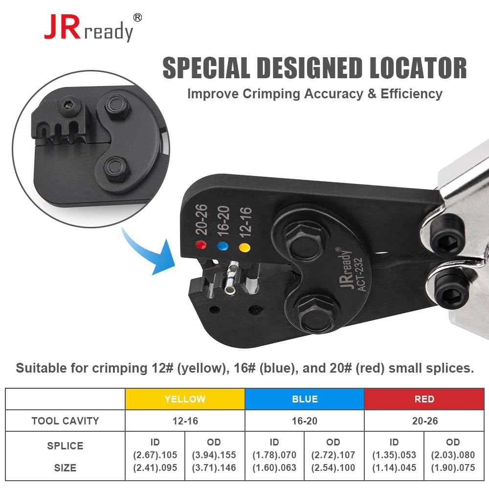 【Applications】 The JRready ACT-232 Hand Crimp Tool, equivalent to M22520/37-01, is designed for crimping M81824/1, 6, 7, 8, 9, 10, 11, 13, and 14 series insulated butt connectors. It is suitable for crimping 12# (yellow), 16# (blue), and 20# (red) environmental splices (M81824/1).