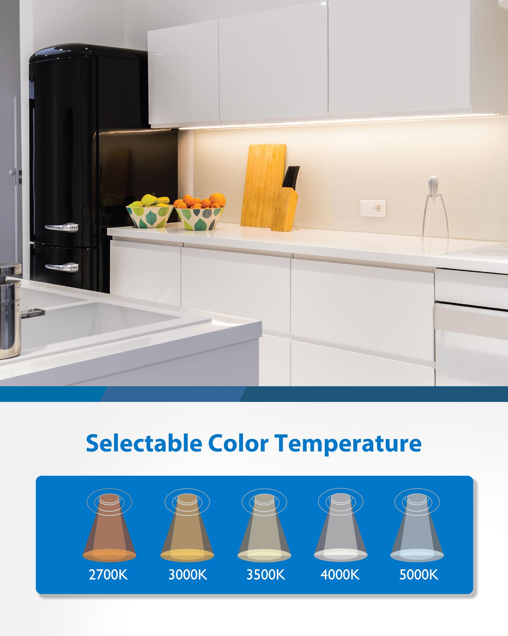 23 Selectable CCT: Choose from 2700K, 3000K, 3500K, 4000K, and 5000K to suit any mood or setting. With a 90 CRI, R9 over 50 rating, and polycarbonate diffuser, our wired under cabinet lighting provides accurate colors and uniform lighting.